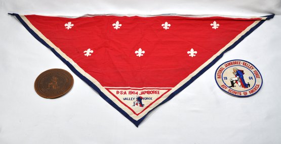 Boy Scouts 1964 National Jamboree neckerchief & patches, one patch is leather.