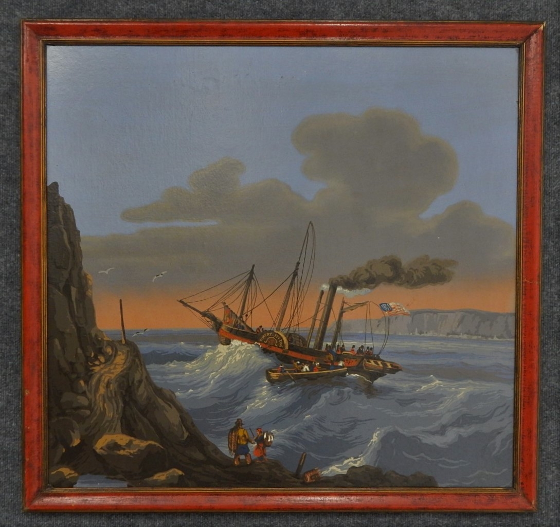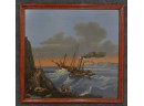 Listed is an original oil on wood panel painting of the steamship Robert Fulton, the artist is unknown. Beautifully framed in red, the piece measures 31"h x 32.5"w. It is in very good condition. Included is a purchase receipt from 1987. Please see photos for details.