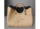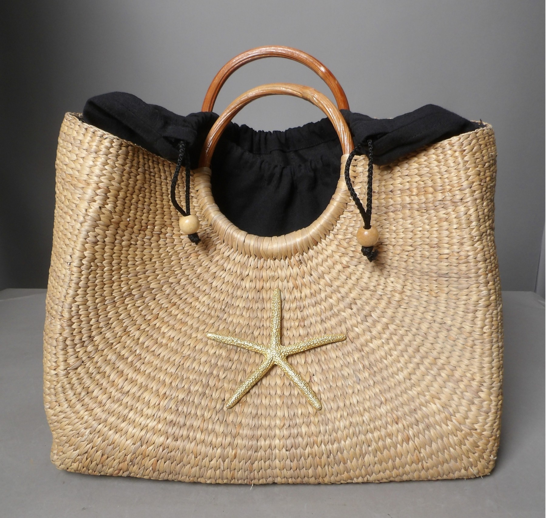 This bag has a gold starfish on the front. There is an inner tie purse. Round, rattan handles. Photos are of all 4 sides, to show the condition of the straw. Really nice!