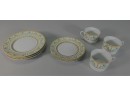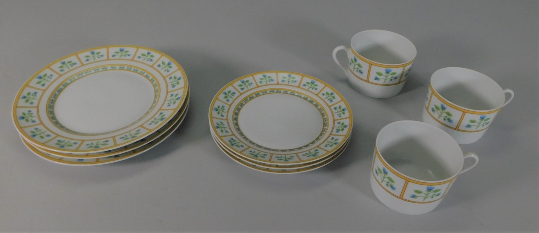 This pattern has blue flowers, green stems, and yellow trim. Muscadin pattern. 3 salad plates, size 7 1/2". 3 bread plates, size 6 1/4". 3 mugs. No chips, or cracks.