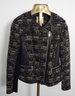 Jacket is black tweed with specks of gray and off white. Asymmetrical zipper. Leather trim. 2 front pockets. Black fabric under the arms. Dry clean only. Armpit to cuff is 17 1/2". Neck to hem is 23". Shipping is available.