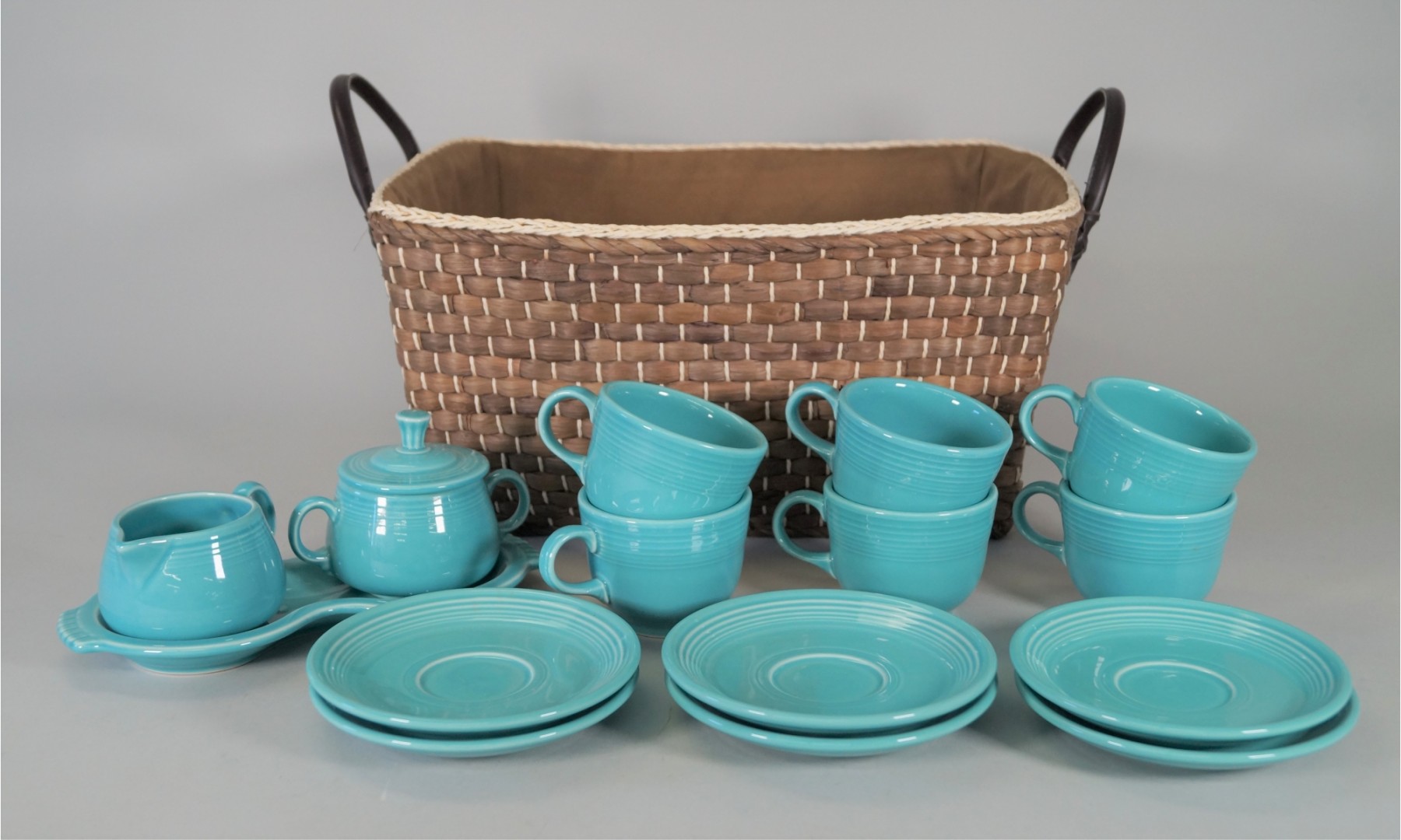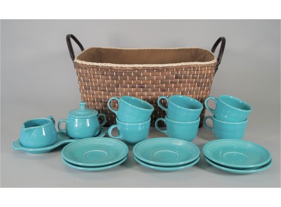 Beautiful set of turquoise reproduction Fiesta Ware consisting of 6 cups and 6 saucers, 1 sugar, 1 creamer and 1 tray. In very good condition with no chips, cracks or crazing. Included in this lot is a nice woven basket measuring 15" w x 7.5"h x 11"w. Please see photos for details.
