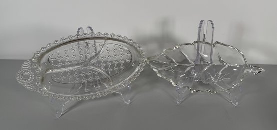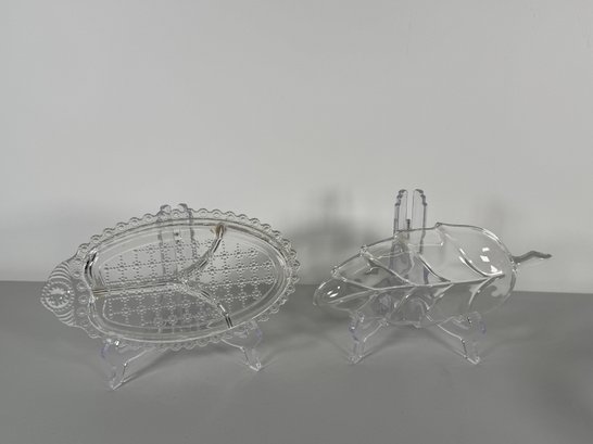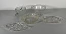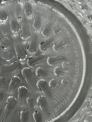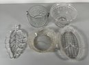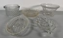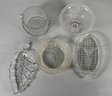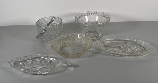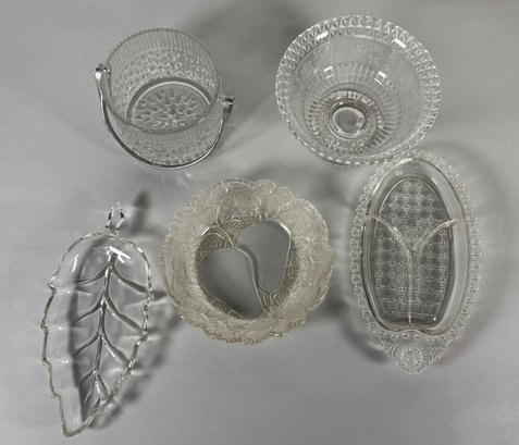 Collection of five pressed glass serving pieces. Includes an ice bucket marked 'Exclusively for Teleflora in France', a footed bowl, a small bowl, and two divided serving dishes, one in the shape of a leaf. Tallest: 4.25 inches; Widest: 8.5 inches.