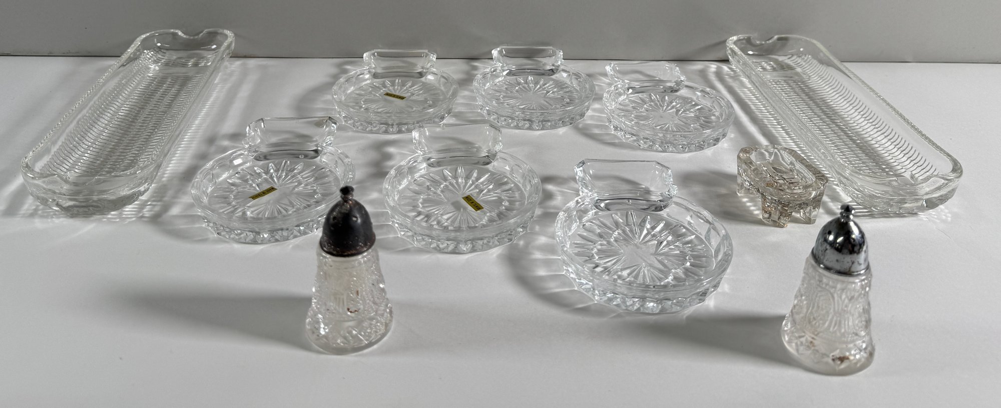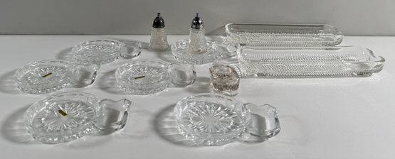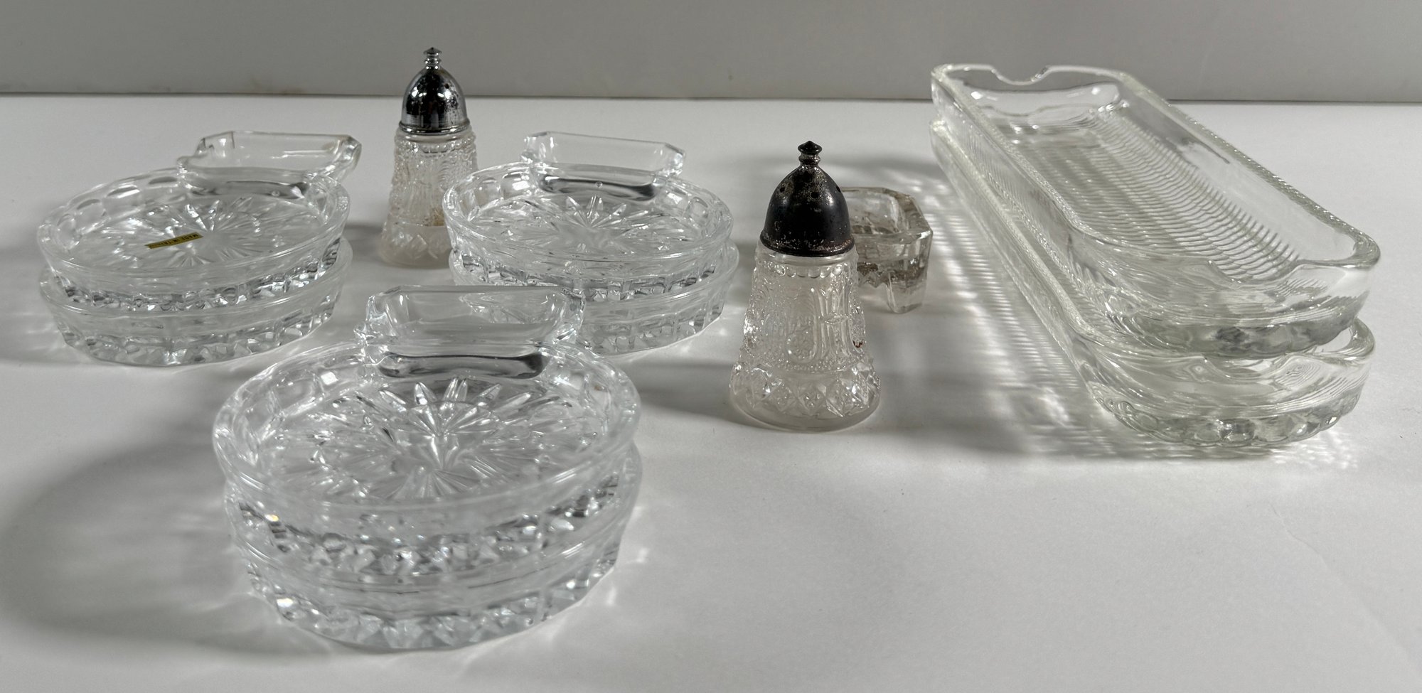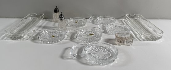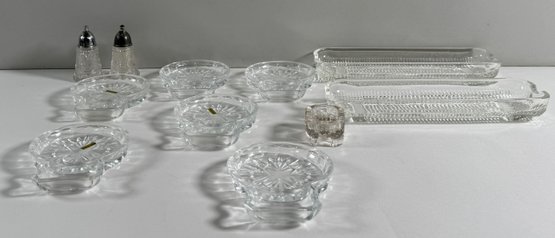 Set of pressed glass serving pieces, including two trays (8.25 inches long), six handled bowls (5 inches long), and two salt shakers (1.5 inches tall).