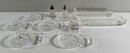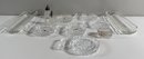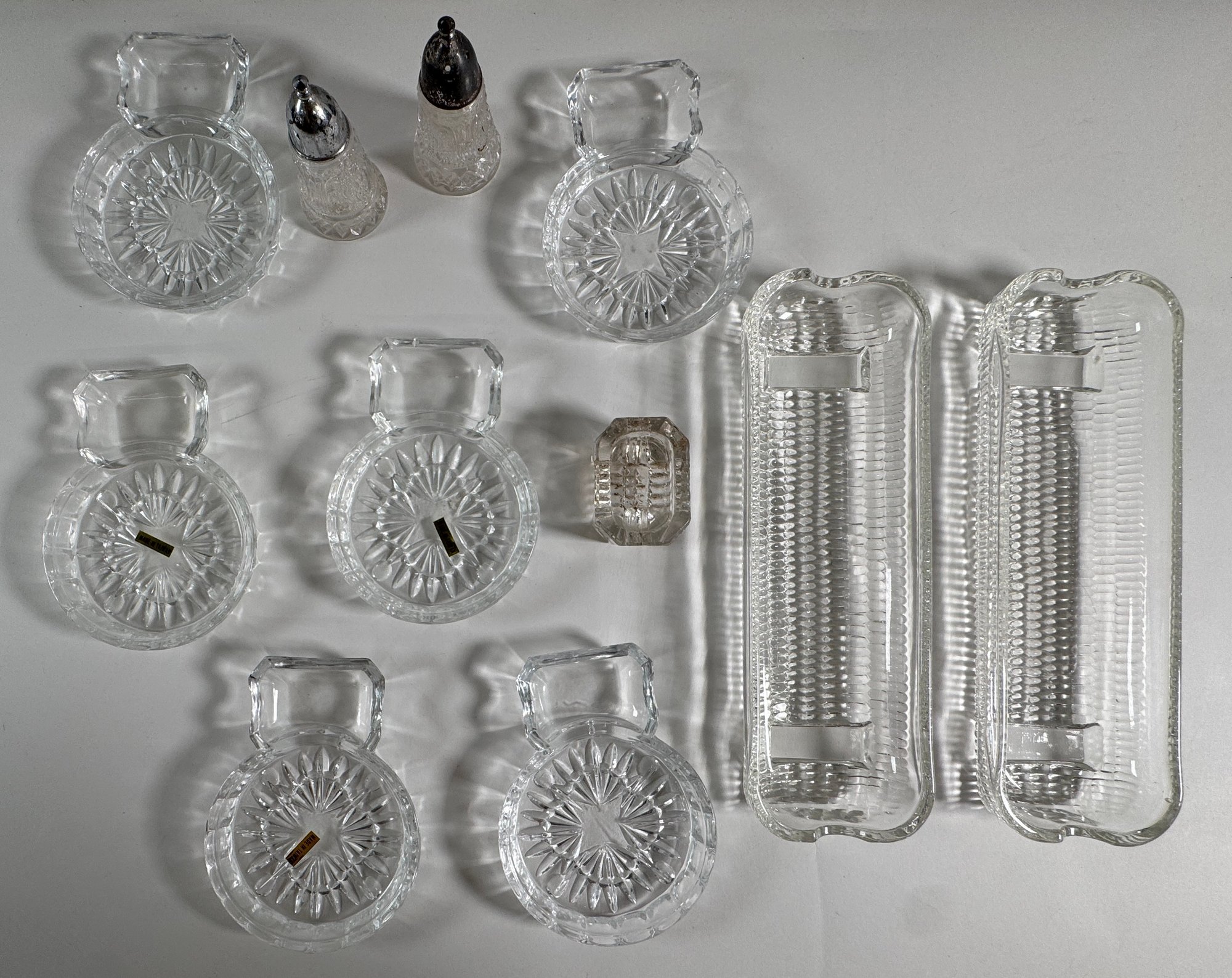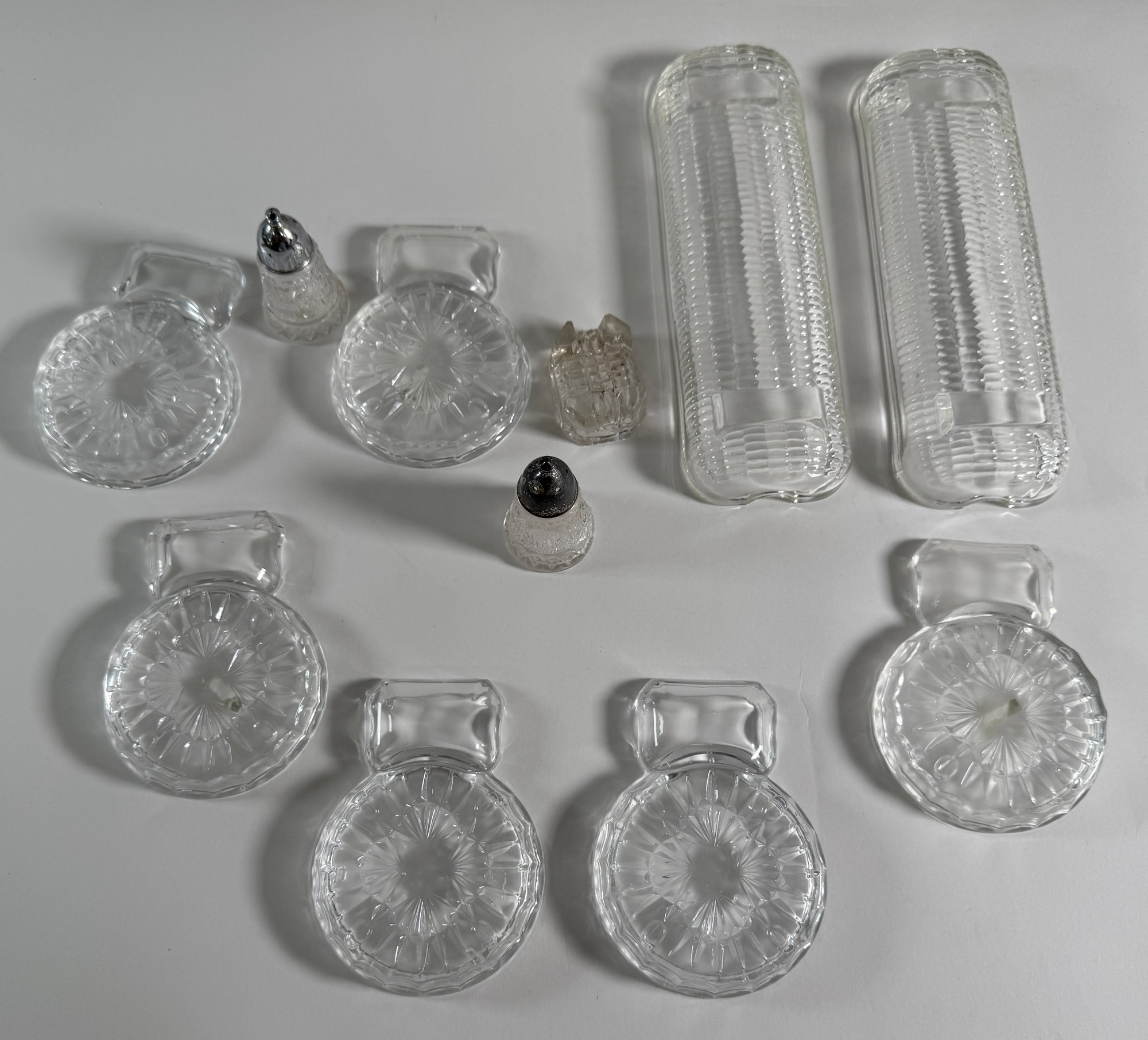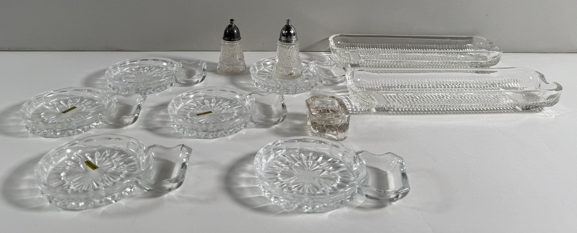 Set of pressed glass serving pieces, including two trays (8.25 inches long), six handled bowls (5 inches long), and two salt shakers (1.5 inches tall).