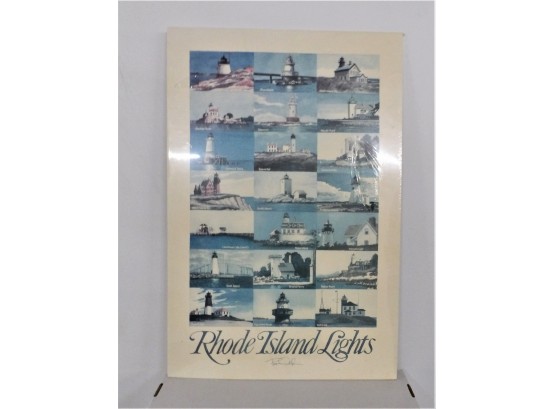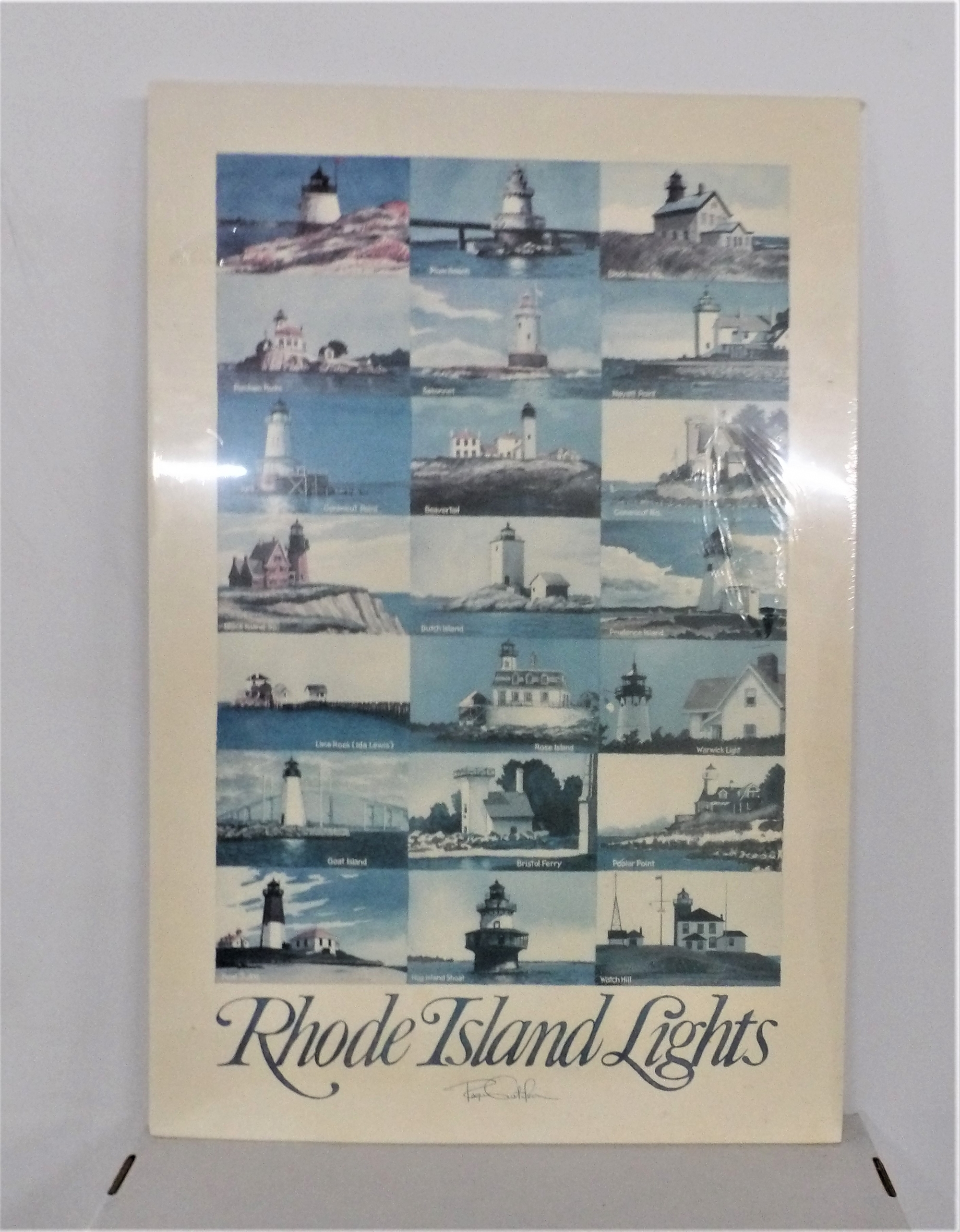 Listed is a poster entitled Rhode Island Lights with the autograph of the artist Roger Gustafson. It is 24" x 36" and wrapped in cellophane (which is slightly ripped on the right side). The poster is faded which gives it a "fair" in condition. See photos for details.