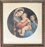 Framed painting depicting Madonna and Child with Saint John the Baptist. The painting is presented in a circular format within a square frame. The frame is ornate with a gold and brown finish.