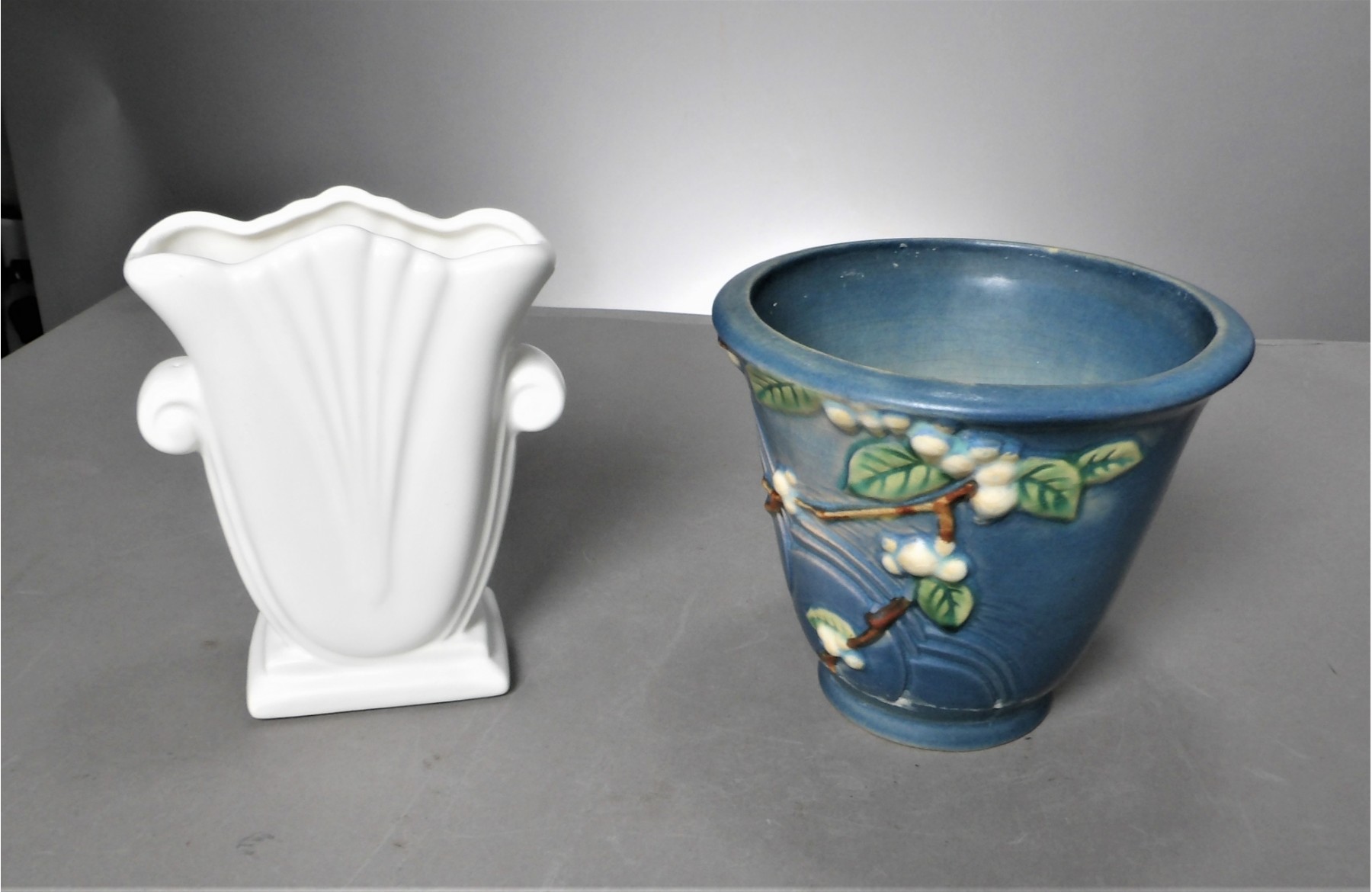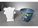 Listed is a beautiful Roseville planter 5.25"h x 6.25"dia. It is missing the tray and there are 2 small chips - one on the top rim and one on the bottom rim. Also listed is a Royal Haeger vase 6.25"h x 5"w. Condition is very good. See photos for details.