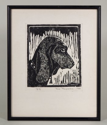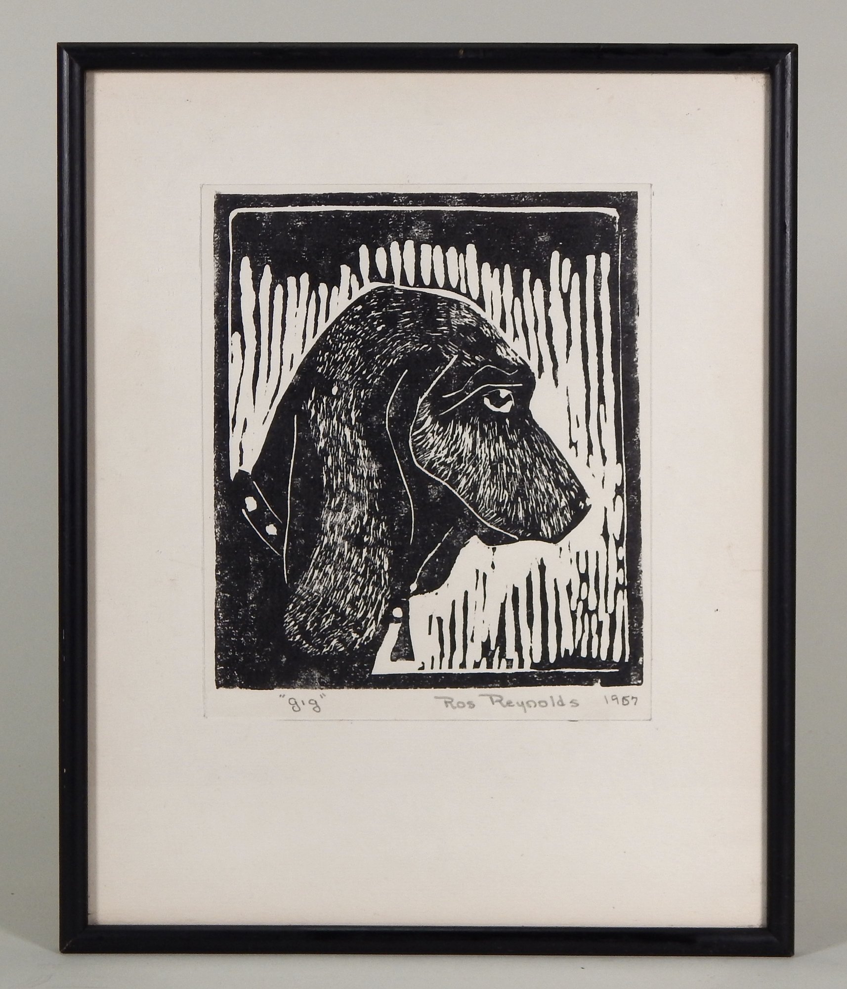 Dated 1957 dog woodcut print by Ross Reynolds.