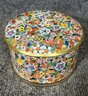 A small round tin box featuring a vivid and intricate floral design on all sides. The pattern includes a wide variety of multicolored flowers and foliage, creating a visually striking and colorful effect. The edges are accented with brass detailing, adding a refined touch to the whimsical floral motif. The tin can serve as a decorative piece or a functional container for small items.