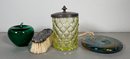 Group of decorative items including a green glass apple, a brush with a metal handle, a yellow glass jar with a metal lid, and a swirled glass paperweight. Tallest item measures approximately 5 inches.