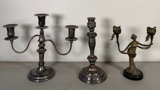 Group of three decorative items including two metal candlesticks and one bronze-tone metal figural candlestick. Tallest item measures approximately 10.75 inches.