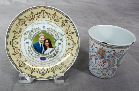 1897 enamel cup commemorates the 60 year reign Diamond Jubilee of Queen Victoria. It measures 3.75"h x 3" in diameter. There are some chips to the enamel and some discoloration to the interior