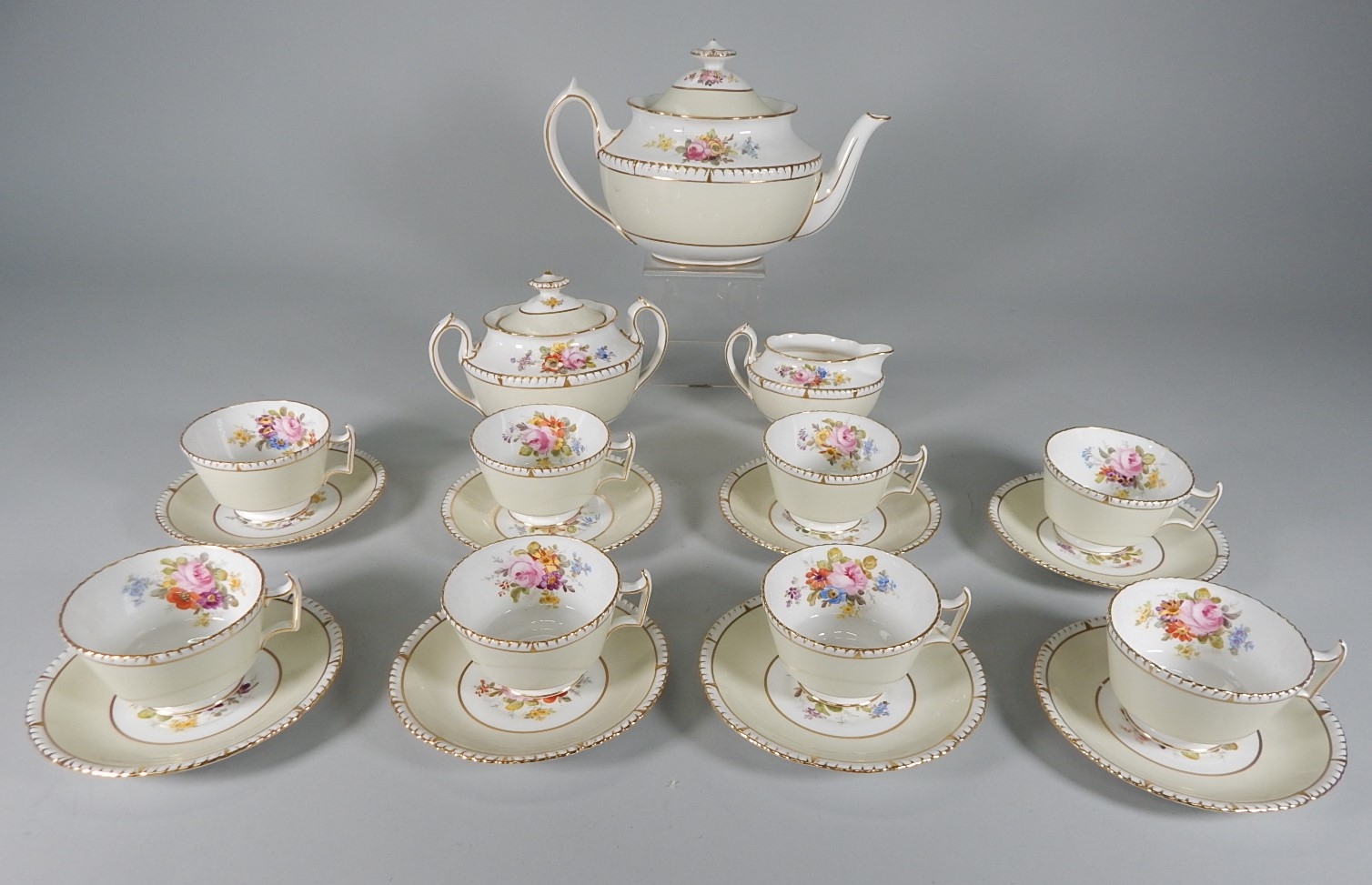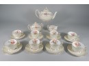 This lovely set includes teapot, sugar and creamer, and eight cups and saucers. I think it is the Rosemary pattern. Made in England. Ivory color with gold edge and flowers. No chips or cracks.