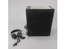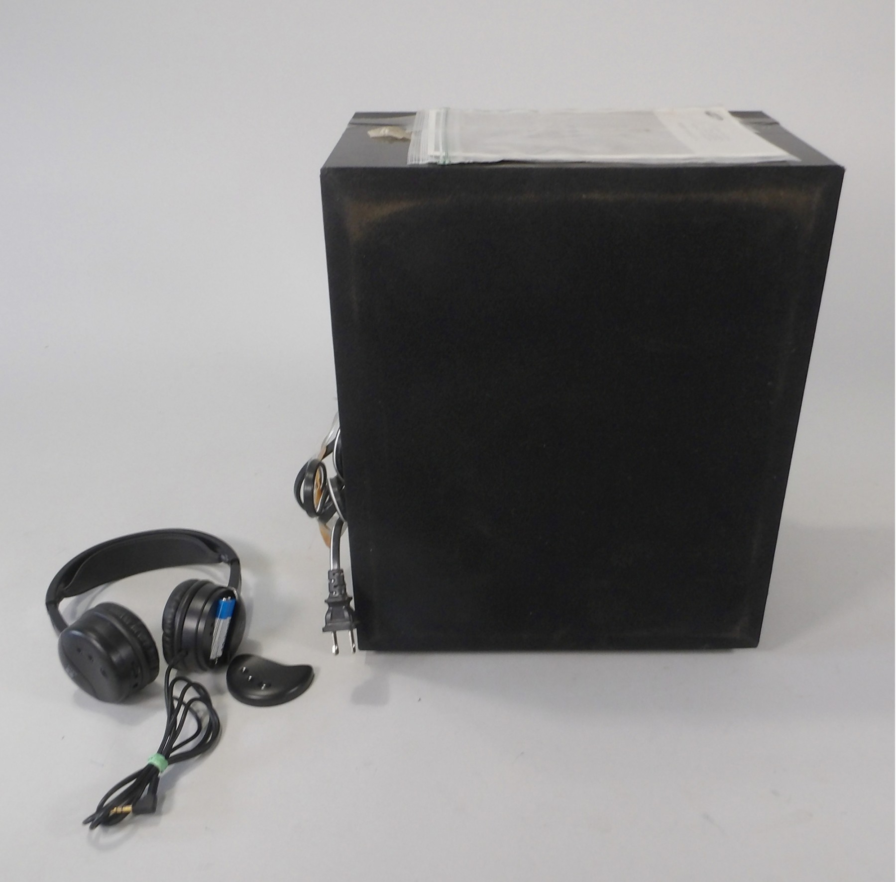 This unit features an Active Speaker System that provides high sound quality in a single slim unit. This unit does not require any satellite loudspeakers or speaker cabling. There is a pair of Akari headphones included. They are noise cancelling headphones. The plastic is cracked, as shown. They do work.