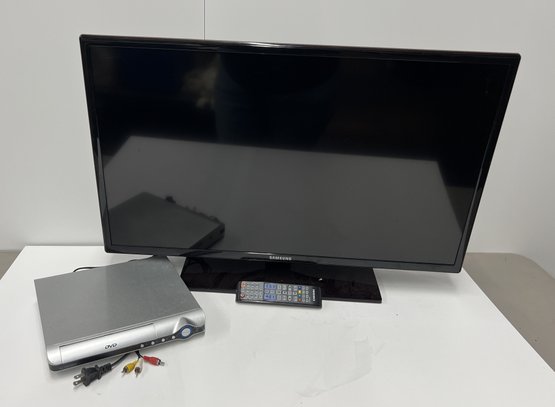 This lot features a small Samsung flat-screen television and DVD player complete with connection cables for video and audio output.