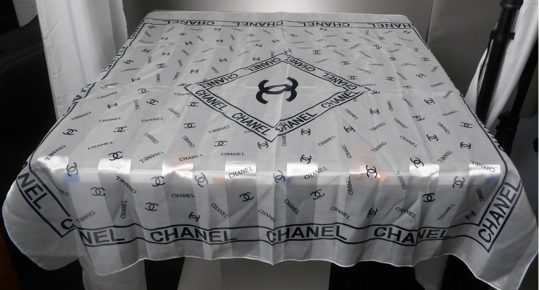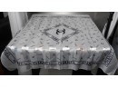 White scarf with blue writing. 38 x 40".