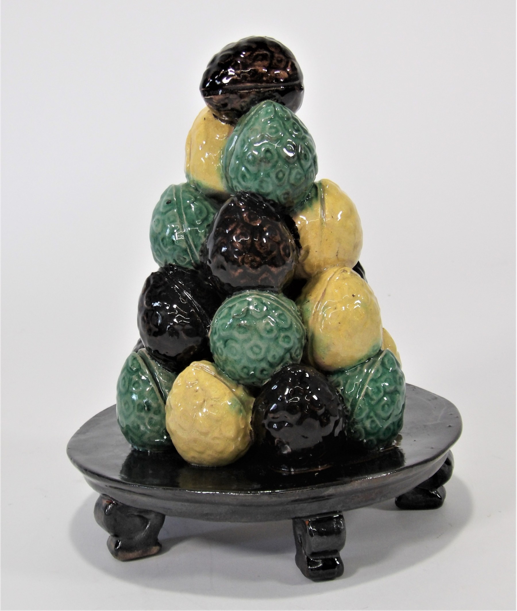 Listed is a unique pottery sculpture of green, yellow and brown walnuts piled atop a brown 5-footed base. It is 8.5" tall with the base being 7" wide. The richly colored glazes add to the beauty of this individual piece. There is one small chip on the edge of the base; otherwise it is in very good condition. Please review photos for details.