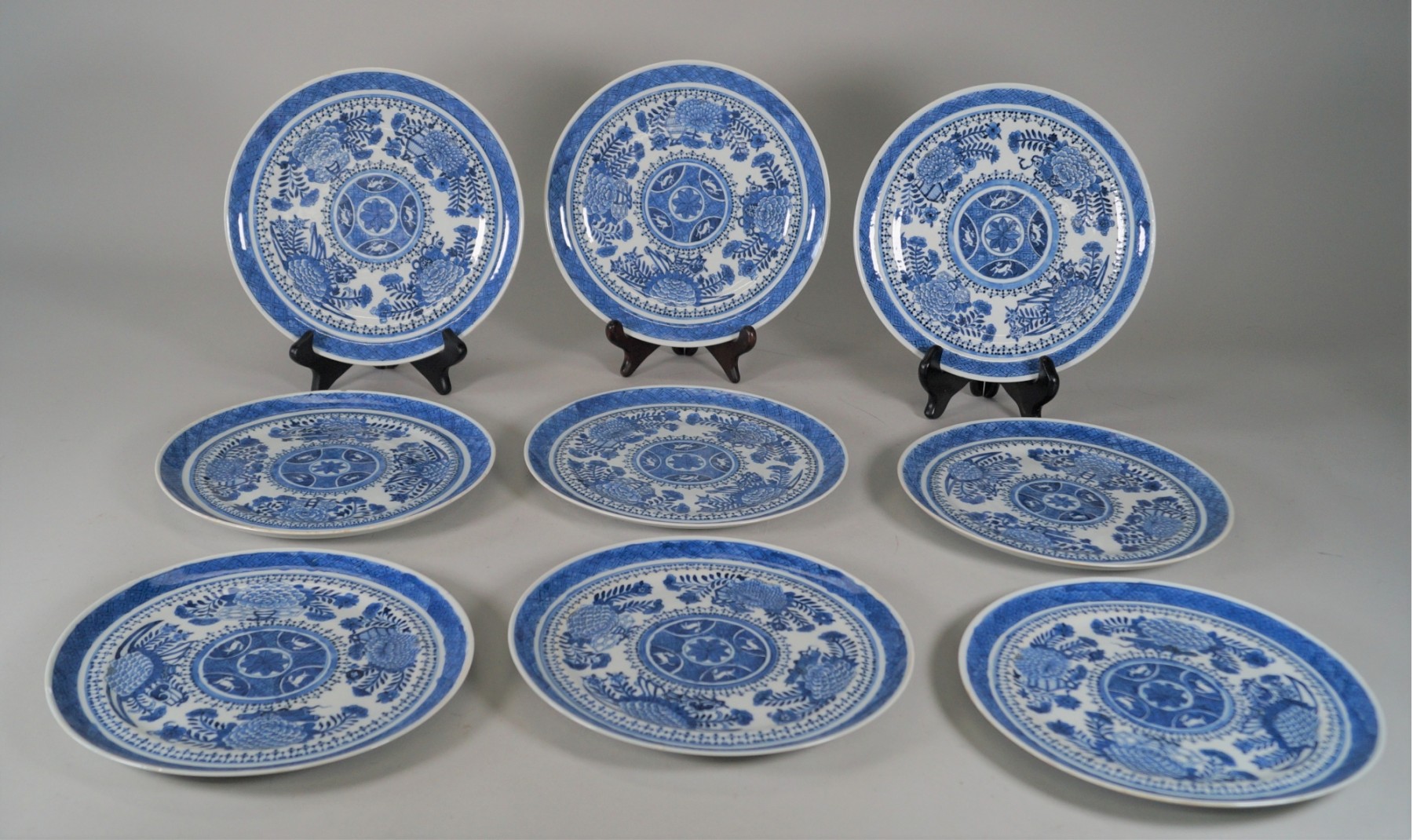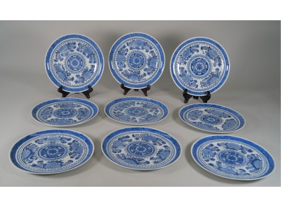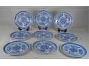 9 plates in this set. Pretty blue and white design. Some have chips, as shown. No marking on the bottom.