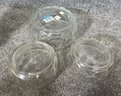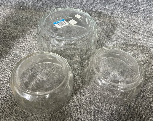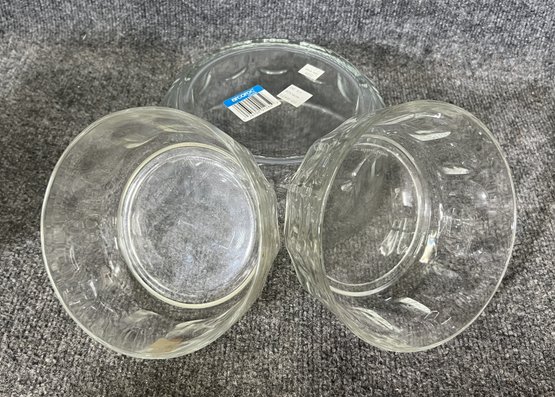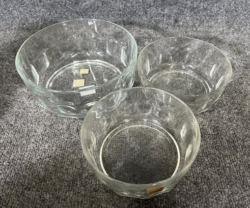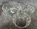 This set includes three clear glass bowls featuring a subtle geometric pattern along the sides.