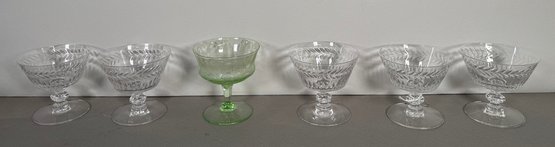 Set of 6 stemmed glasses, 5 clear with cut designs and 1 green. Largest approximately 3.75 inches in diameter.