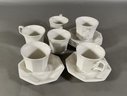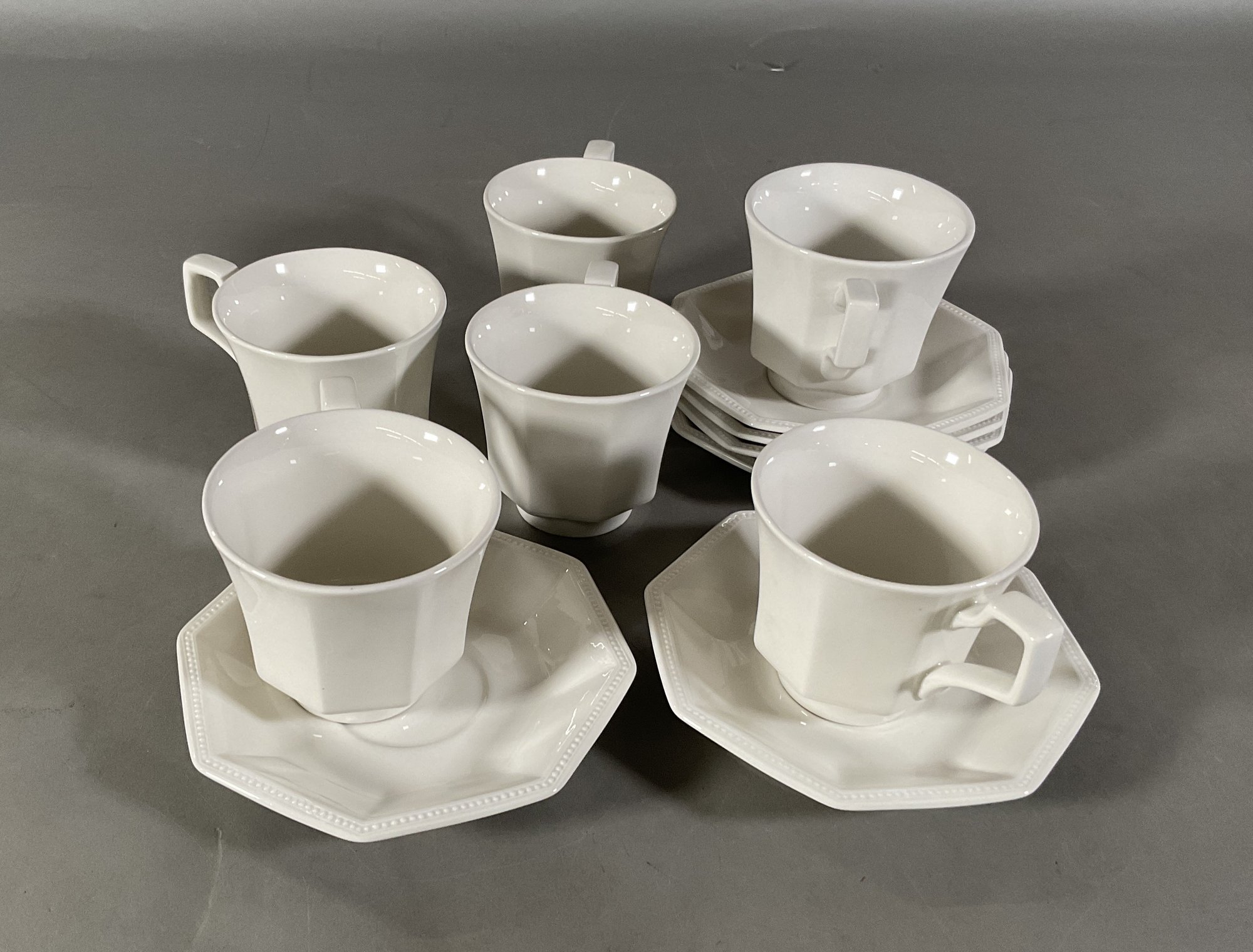 A white porcelain tea set comprising six cups and six saucers. Cups: 3" x 4" (with handle). Saucer: 5" diameter.
