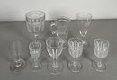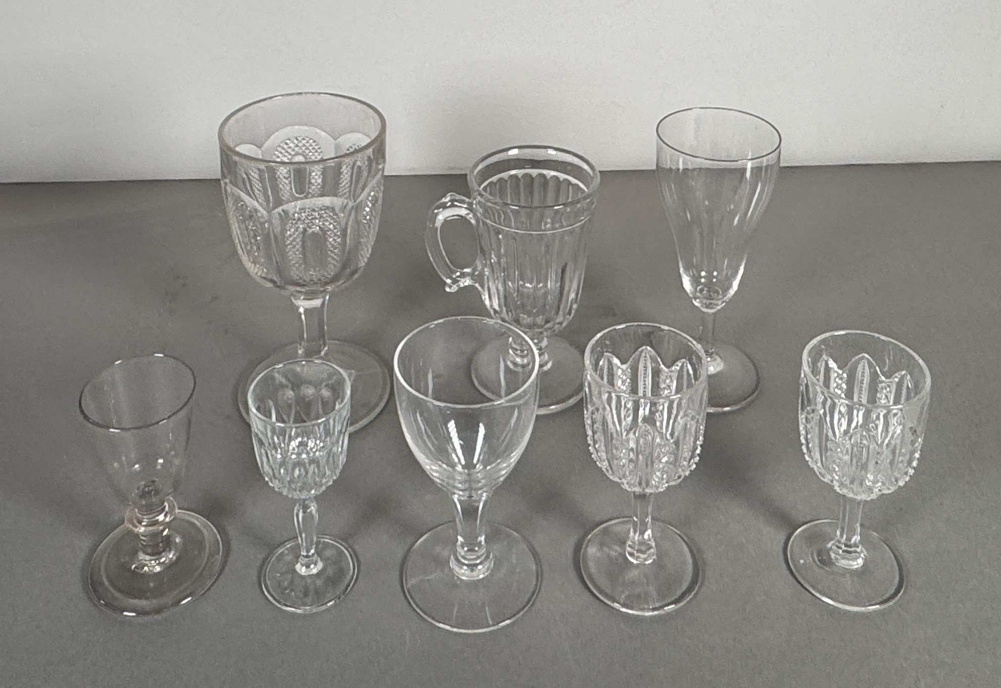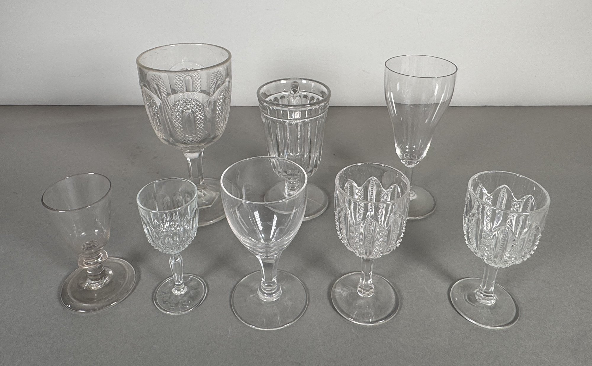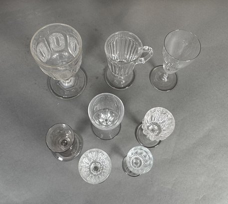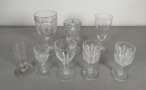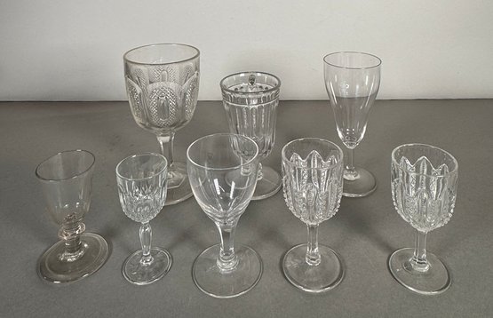 Set of 8 assorted clear glass goblets and cordial glasses. Heights vary, with the tallest approximately 6.5 inches.