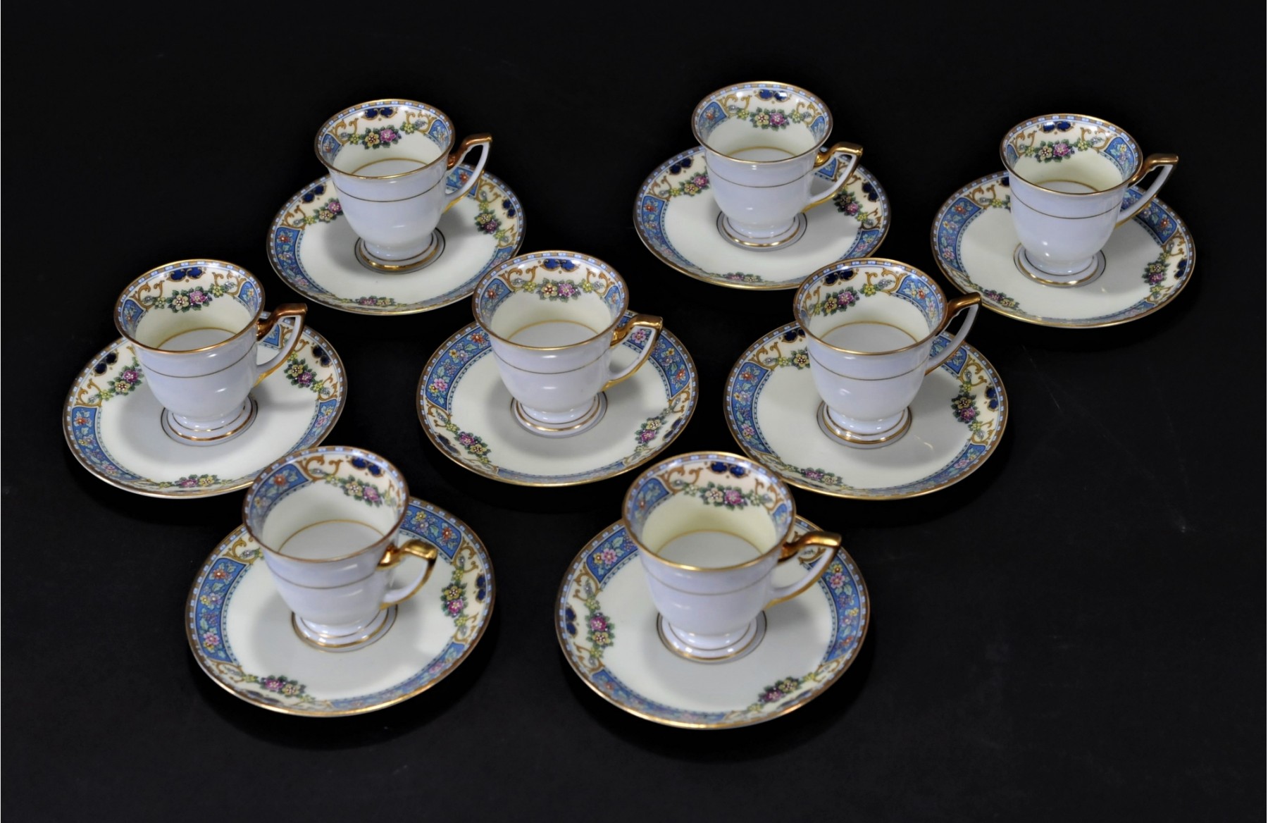Listed is a lovely set of 8 demitasse cups by Thomas of Bavaria. The cup measures 2.5" across and the saucer measures 4.5" in diameter. The set is in pristine condition.