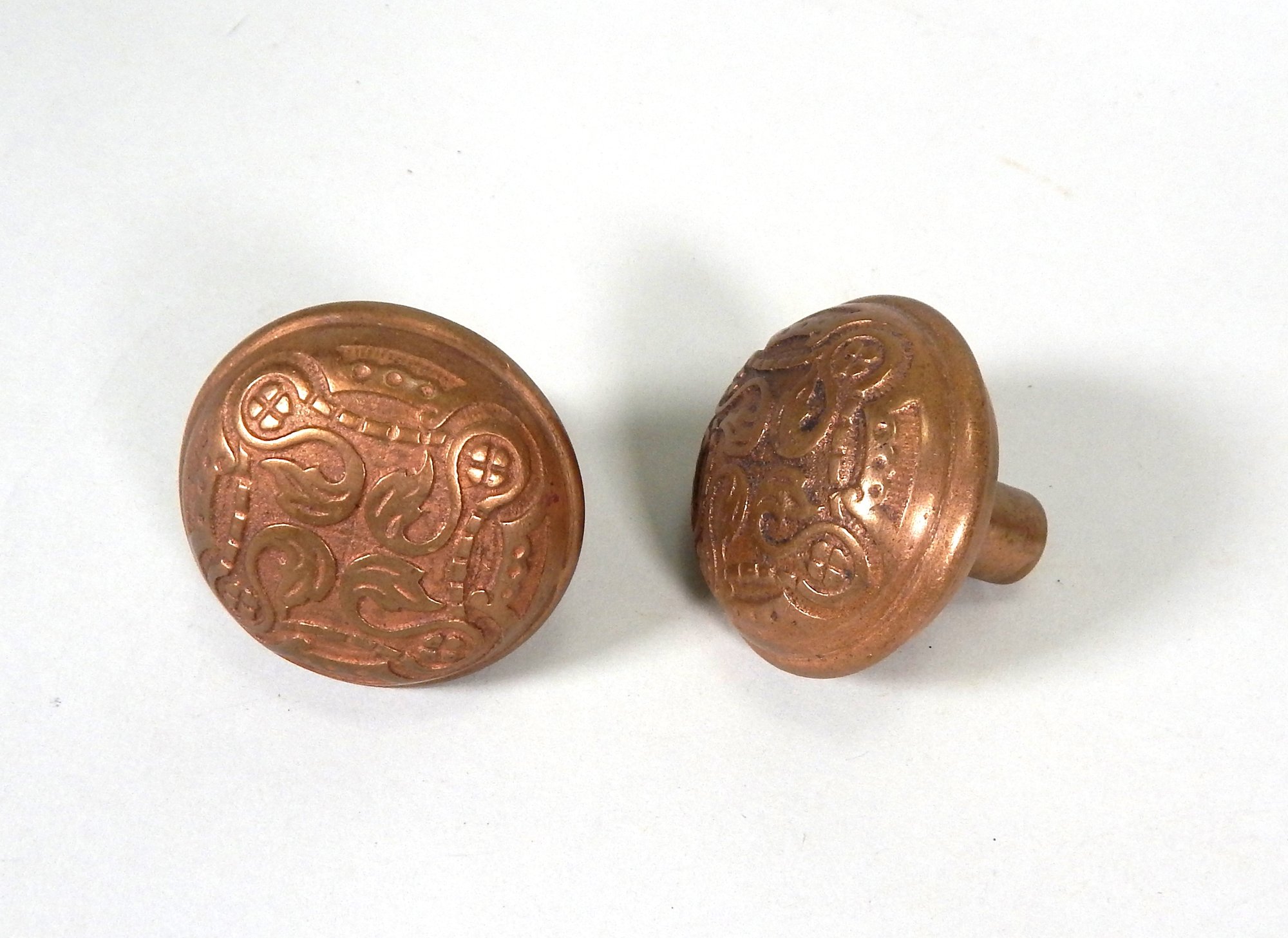 A pair of intricately designed solid bronze doorknobs from the Victorian era.
