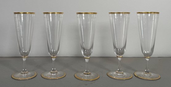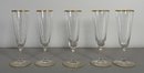 Set of five champagne flutes with gold rim and base accents. Each measures approximately 7 inches tall.