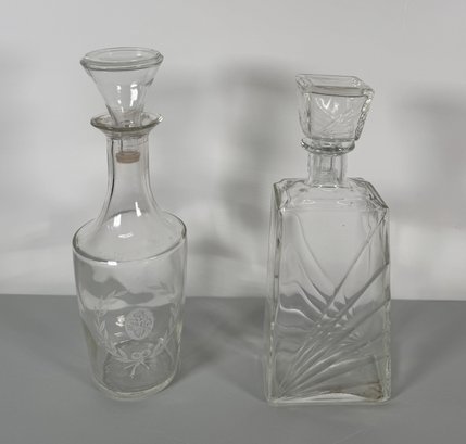 Set of four glass decanters with stoppers. Various shapes and cut glass designs. Tallest measures approximately 11.5 inches.