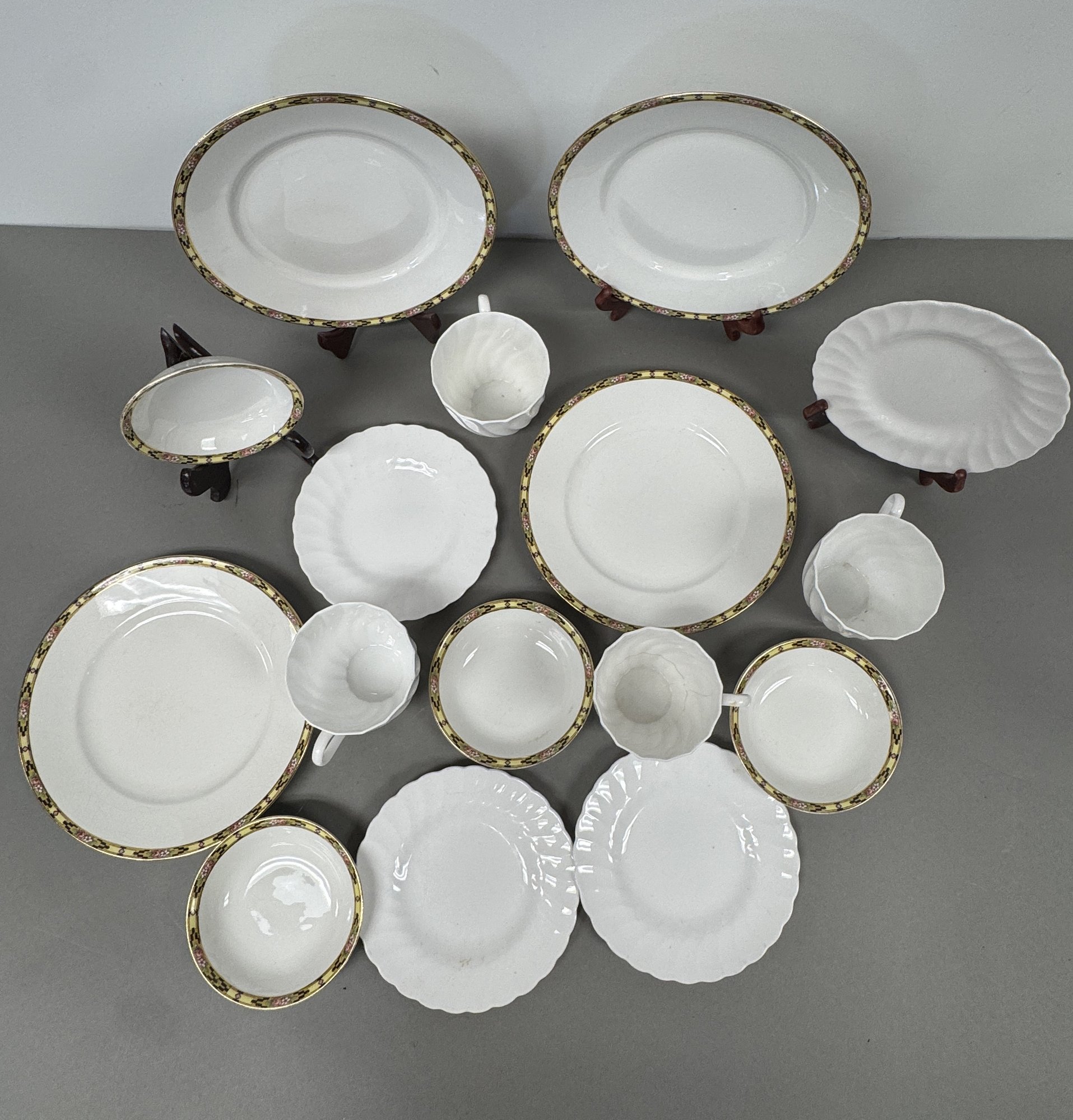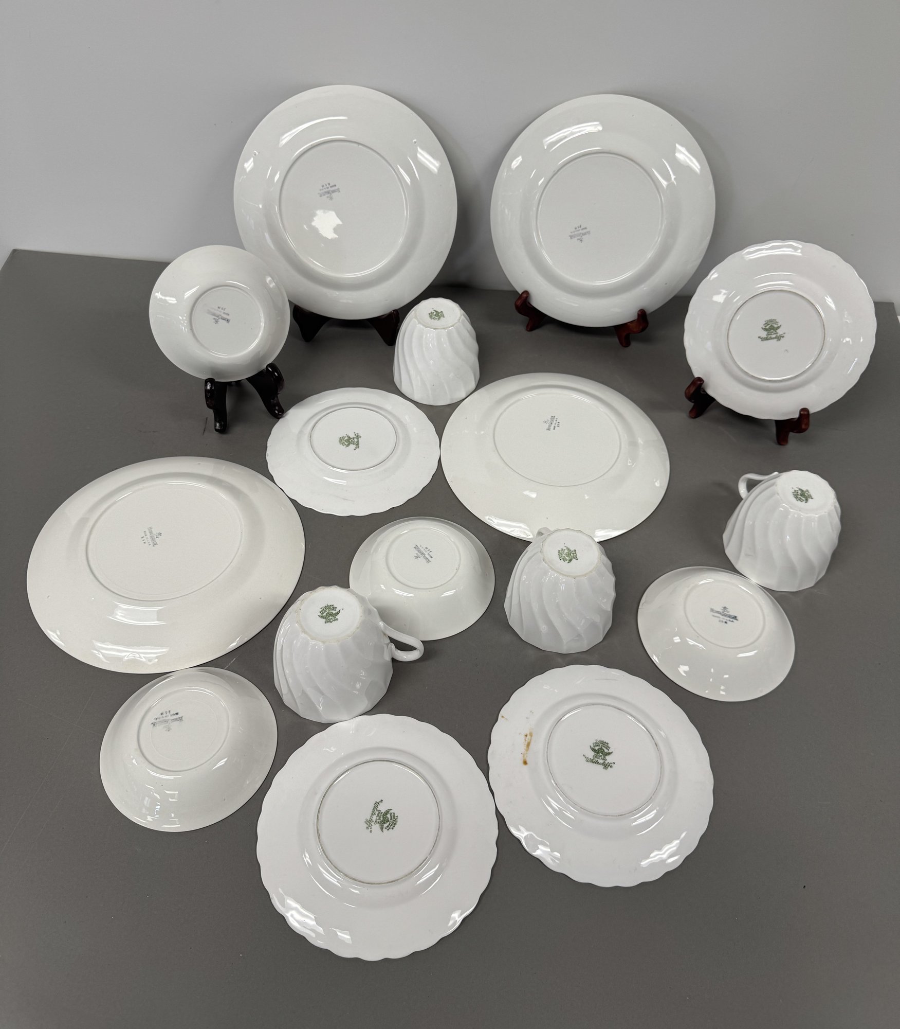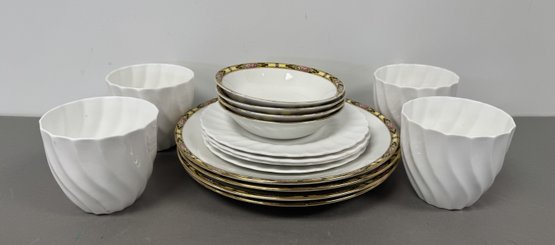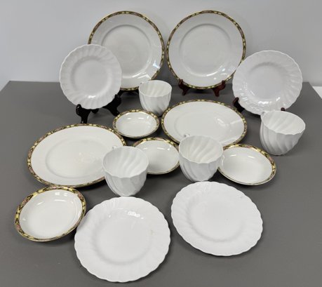 This collection consists of dinnerware from Homer Laughlin and Royal Tuscan. The set includes plates, cups, and serving pieces with varying patterns and sizes.
