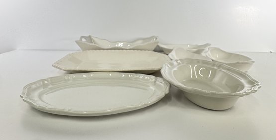 A collection of seven off-white ceramic serving dishes. The lot includes two small oval dishes, one larger oval dish, one rectangular dish, one rectangular tray, and two boat-shaped dishes.
