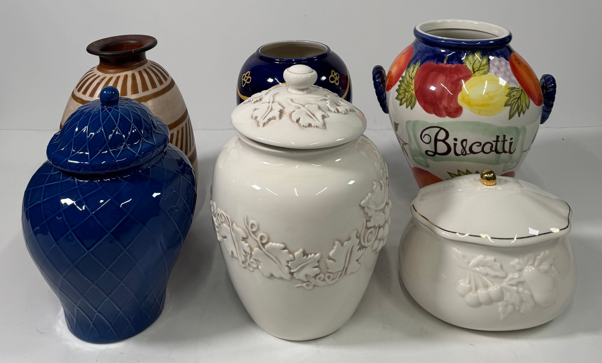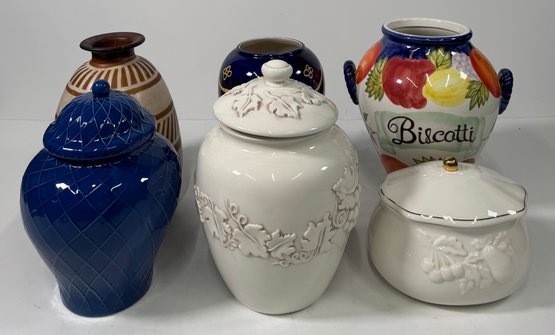 Set of six decorative ceramic vessels, including vases and lidded jars. Sizes range from approximately 6.25 x 6.5 inches to 11 x 5 inches.