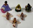 Set of six hand-painted folk art figurines. Includes three winged musicians and three seated figures. Sizes range from 4 to 6.25 inches.