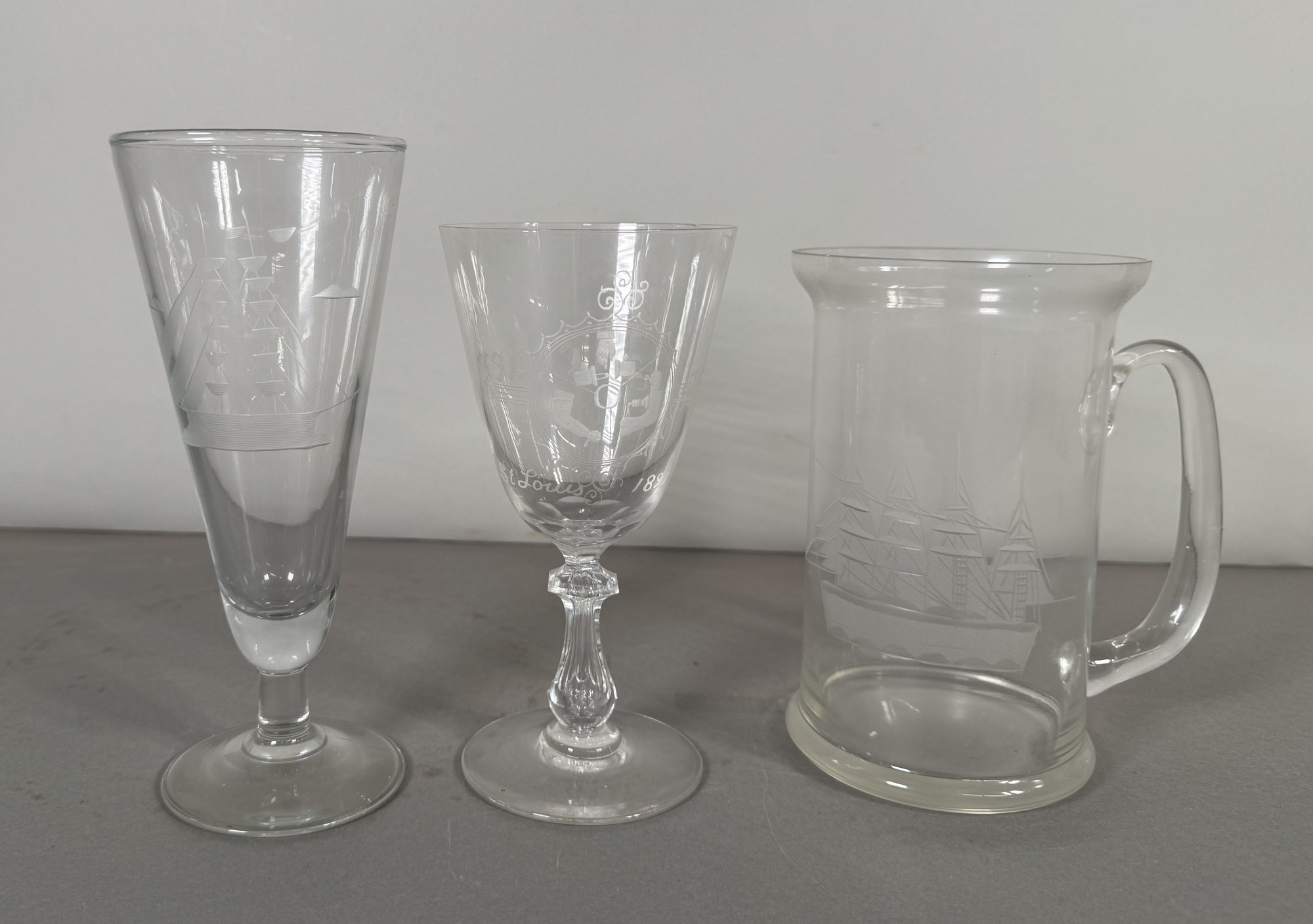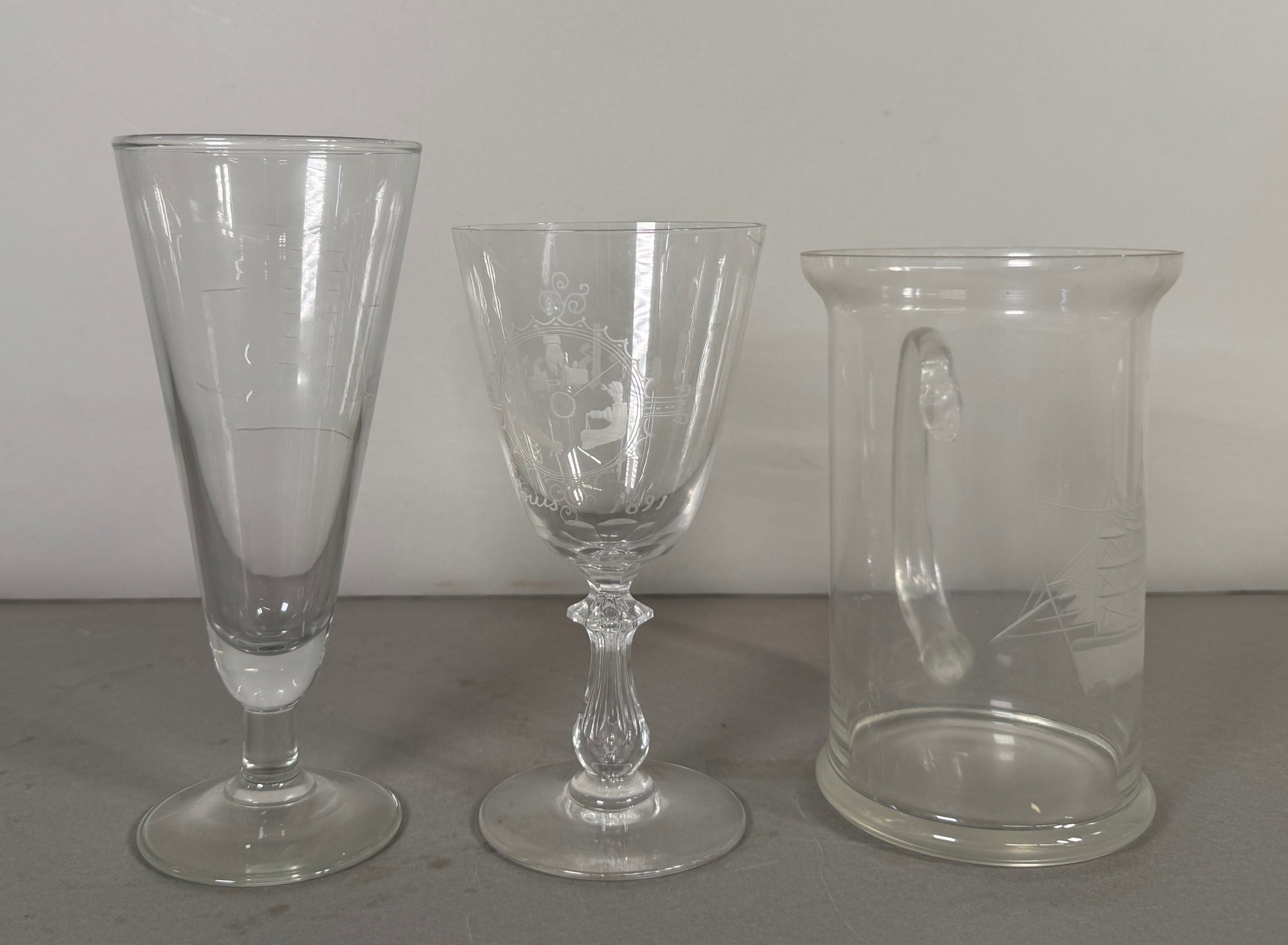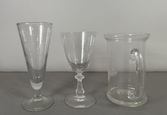 A beer mug with a handle and etched embellishments.