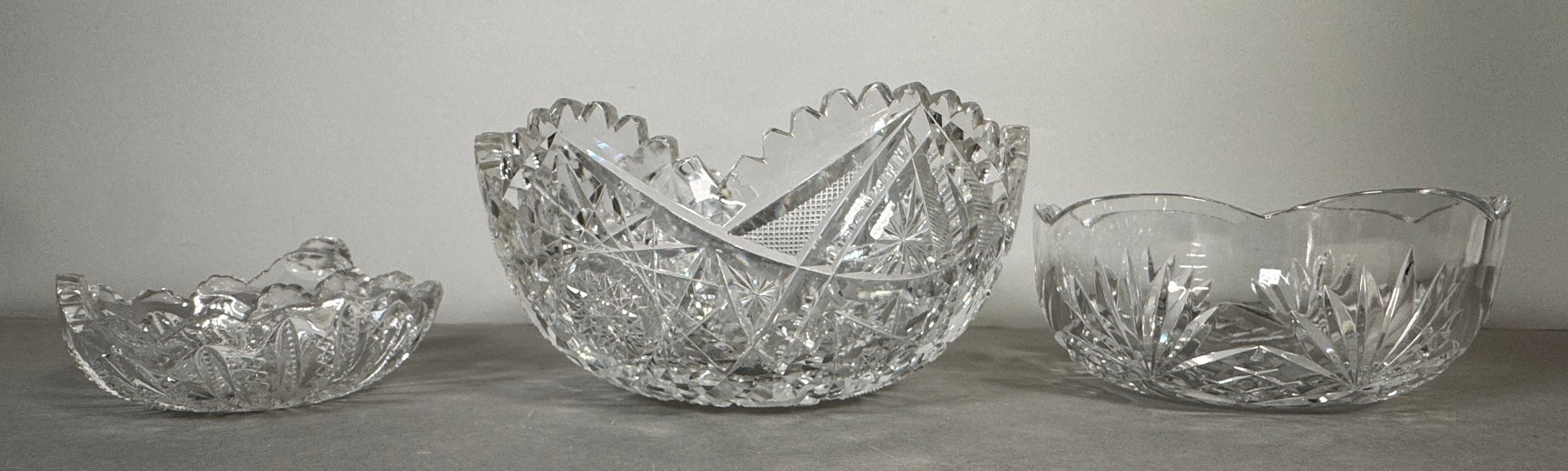 Set of three cut glass bowls. The largest bowl is marked 'Rogaska'. The tallest item measures approximately 3.5 inches.