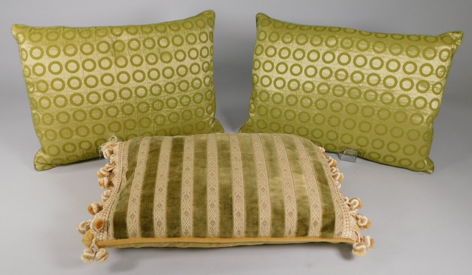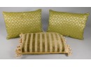 Pillows are in great condition. Olive green with circles. Same print on front and back. Striped pillow has plain colored back, and a zipper.