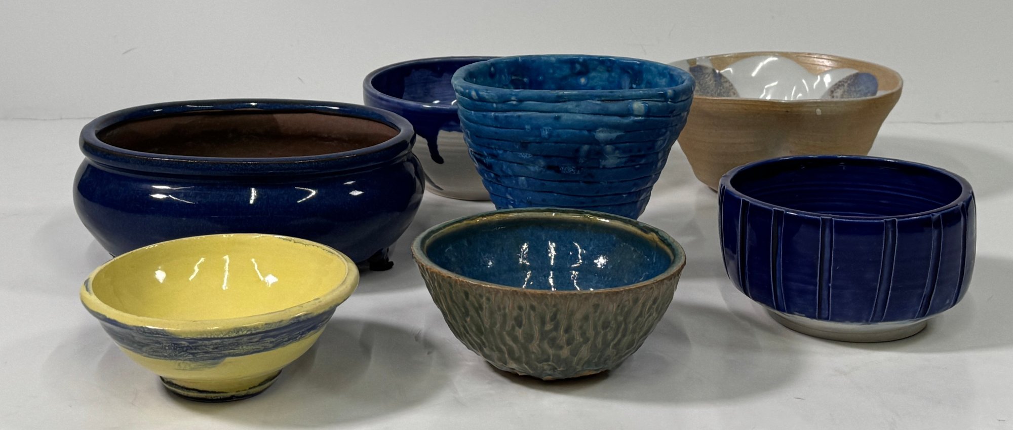 Collection of seven studio pottery bowls in various sizes, shapes, and glazes. Includes blue, yellow, and tan colored bowls.