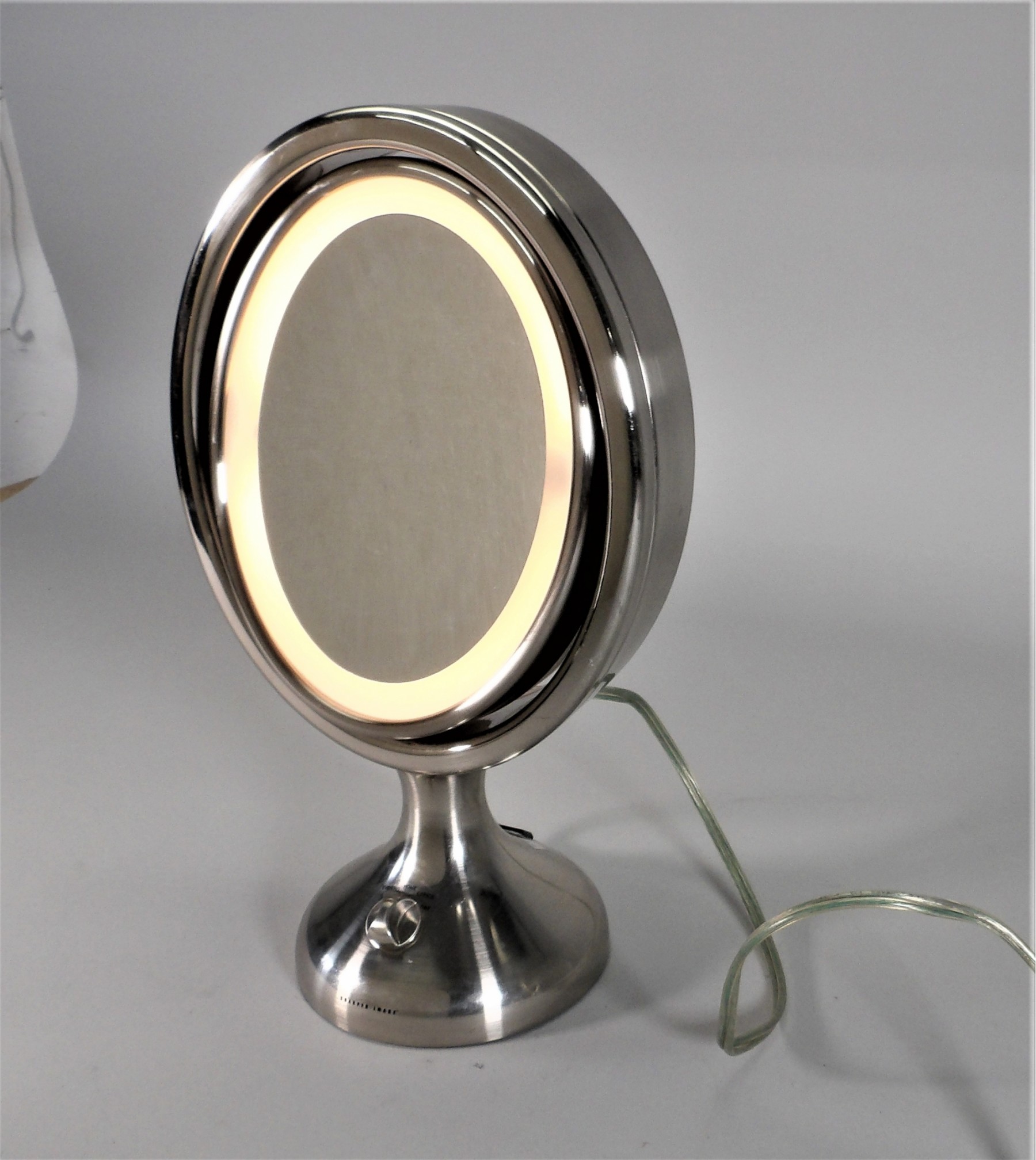 Listed is a very handy table top mirror by Sharper Image. The oval mirror measures 11.5"h x 9.5"w x 2.5"d. The overall height with the base is 16.5". There are a few scuff marks here and there but nothing major. This mirror lights up and there is an outlet in the back. Condition is very good. See photos for details.