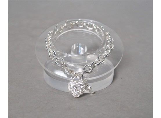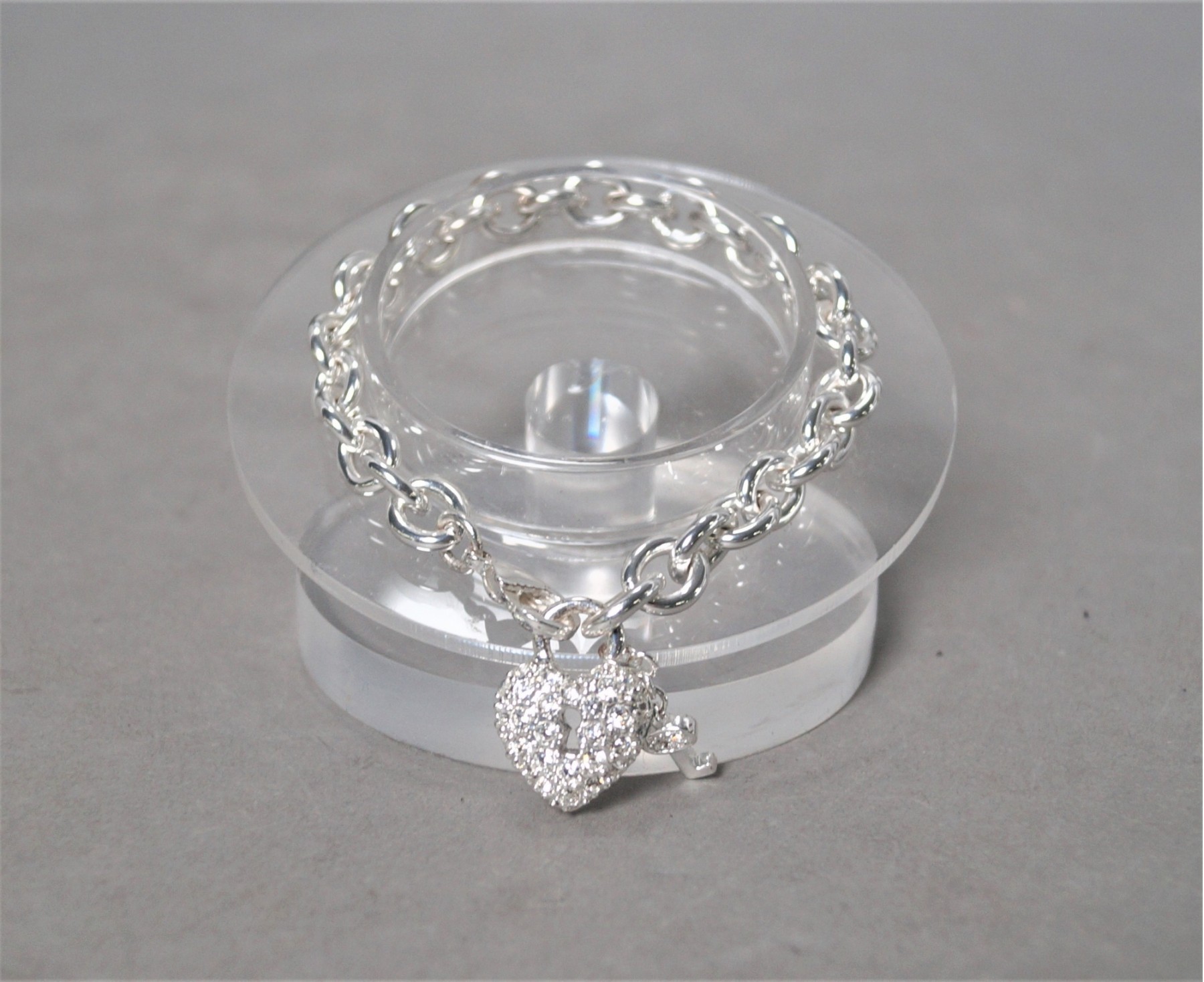 Silvertone linked bracelet with cz heart and key charm. New old stock.