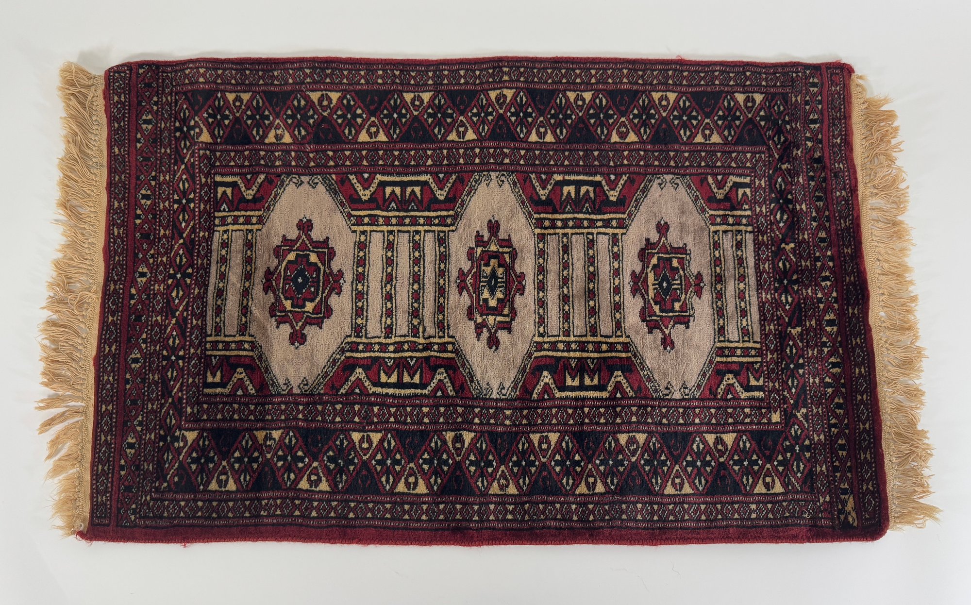 A small, rectangular rug with a rich burgundy field and intricate geometric and floral patterns in shades of beige, black, and brown. It features a fringed edge. Measures approximately 25.5" x 42.75".