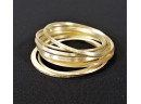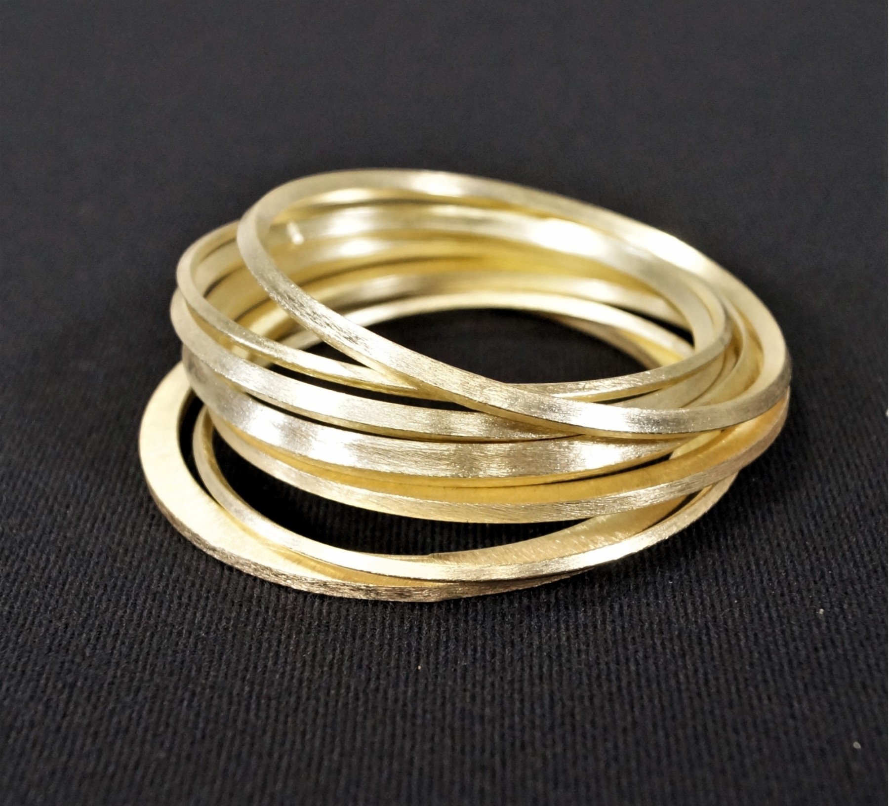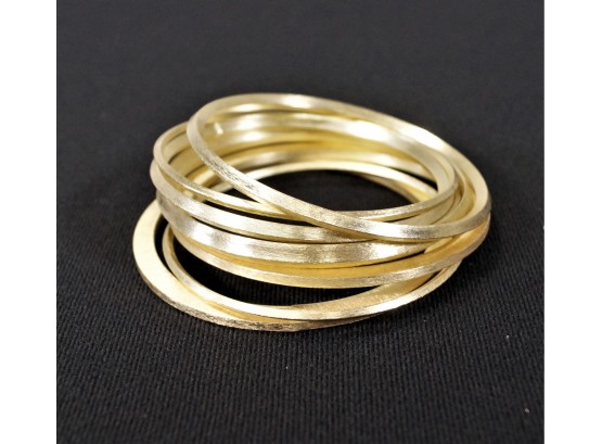 listed is a lovely set of 7 brushed gold tone jingly bangles measuring 8" in circumference. They are lightweight (aluminum?), and of varying thickness. In very good, unworn condition. Please see photos for details.