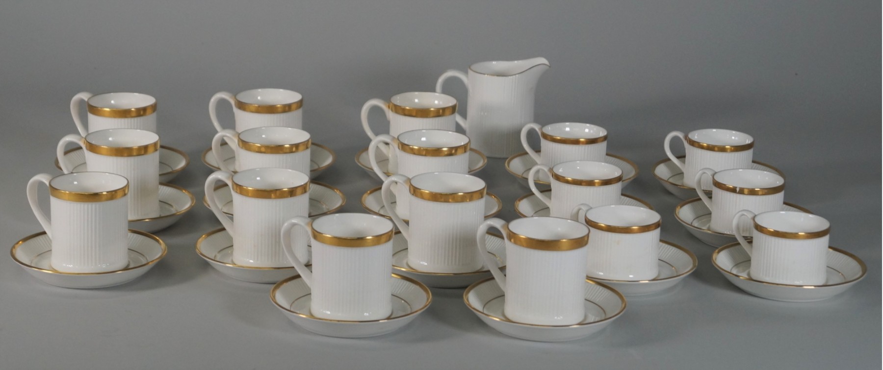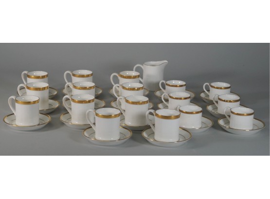 Listed is a set of Staffordshire Golden Glory coffee and demitasse cups and saucers. There are 6 demitasse cups, one has a small chip, all others in very good condition. There are 11 coffee cups, one has discoloration, all others in very good condition. The 17 saucers fit both the espresso and the coffee cups. One saucer has some discoloration and one has a repaired break, all others are in are in very good condition. The creamer is in very good condition. See photos for details.