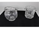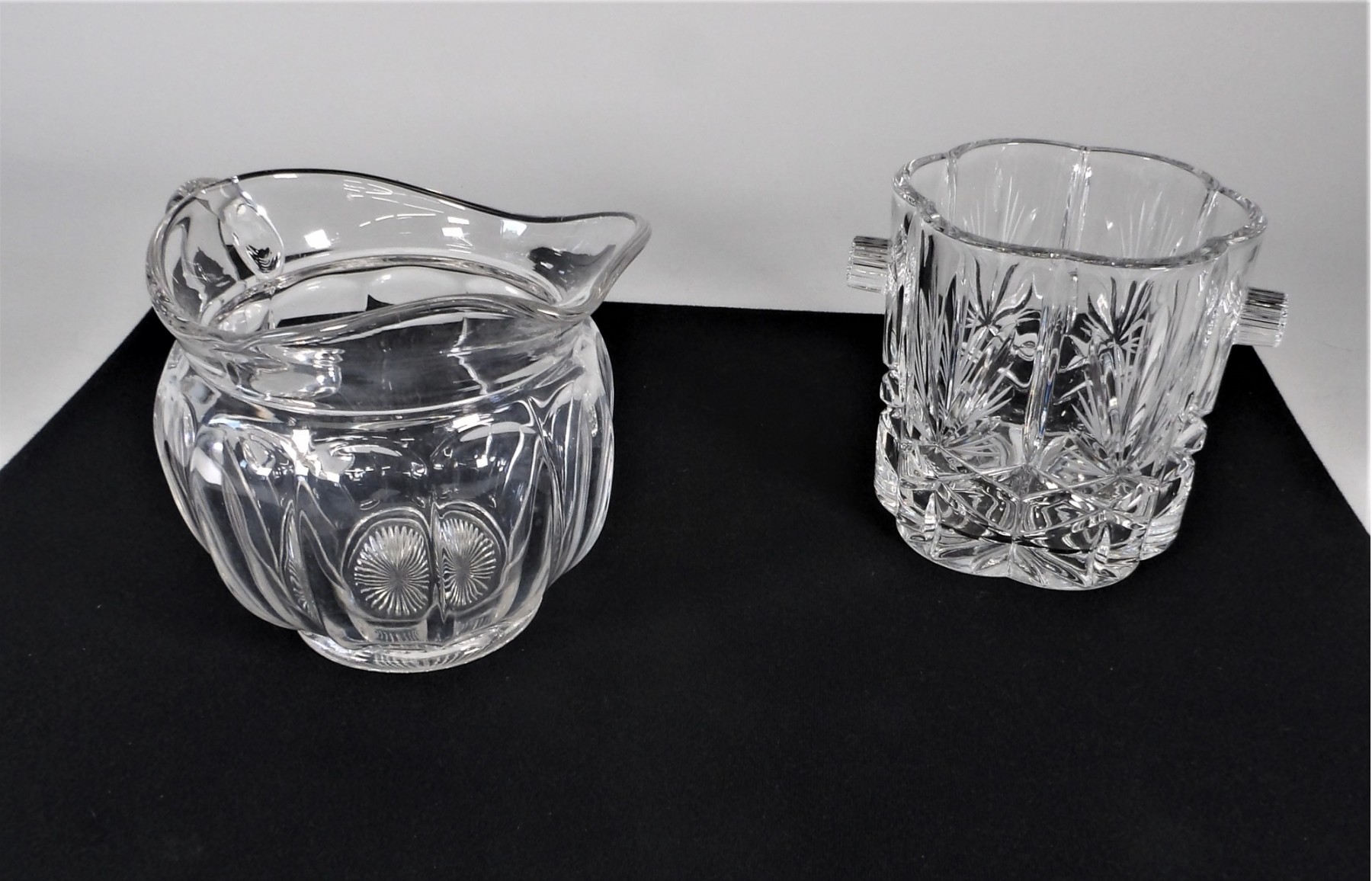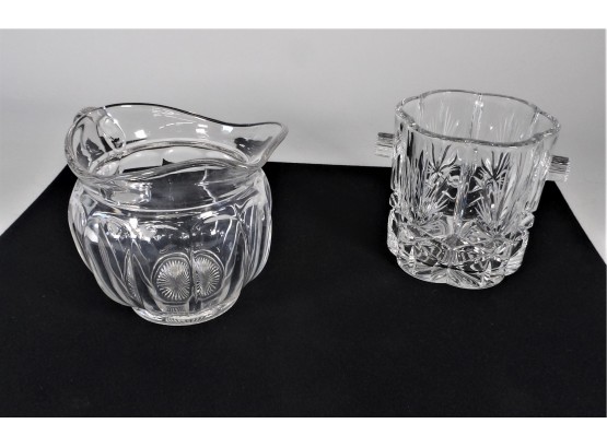 Listed is a beautiful cut glass ice bucket 6"dia. x 6"h. It has a scalloped opening and 2 ribbed handles. Also listed is a wide mouthed glass pitcher 9"w including handle and 6.5"h. Both pieces are in very good condition. See photos for details.