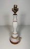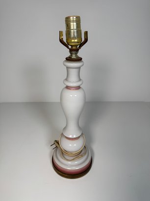 A table lamp, approximately 16.5 inches high. The lamp features a white and pink swirl design on the base and a brass fitting.