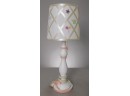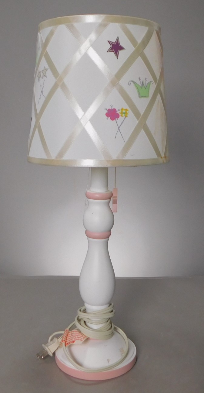 Base is white with pink trim. White shade with stars, crowns, and flowers.