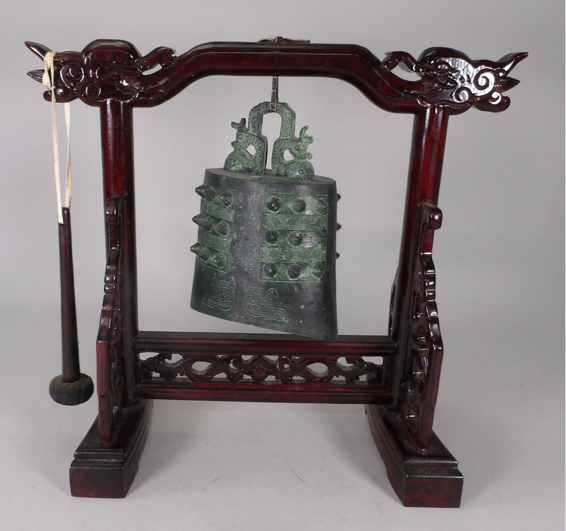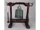 This gong is engraved and is decorated with studs. Hangs by a leather strap. Comes on a nicely decorated base.