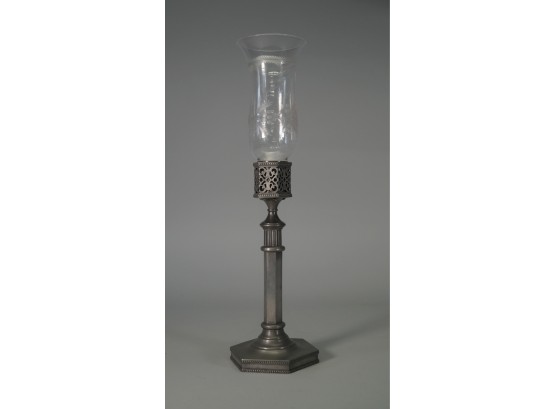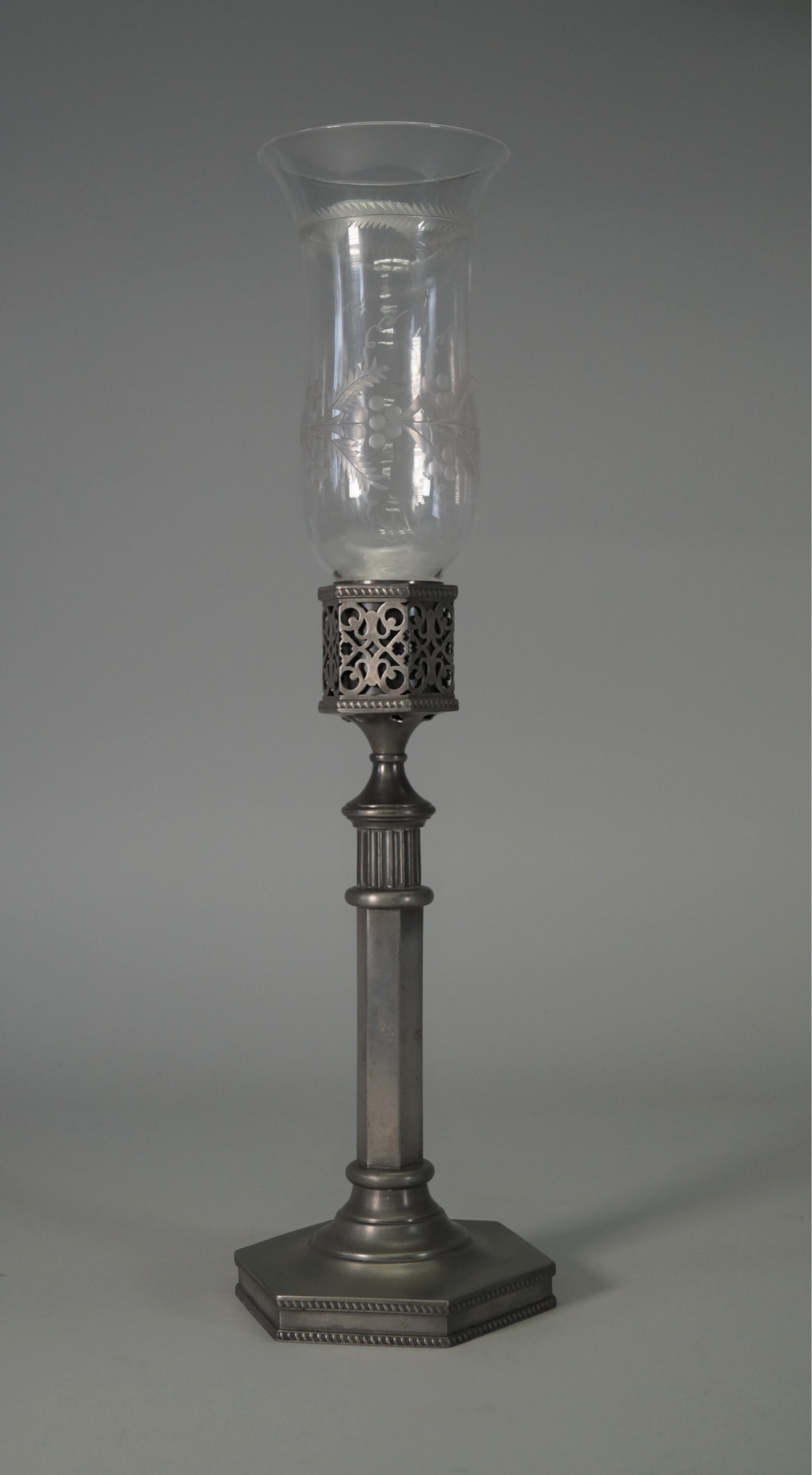 Listed is a pewter candlestick with lovely etched glass shade. It measures 19.5" tall, base is 5" across. In very good used condition.