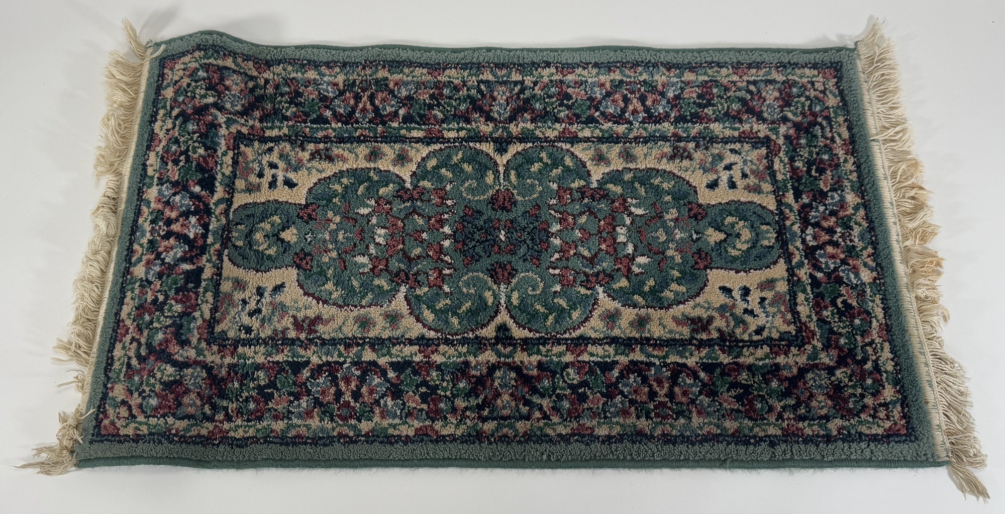 A rectangular rug with a teal background and an intricate, repeating pattern in shades of pink, cream, and dark teal. The rug has a fringed edge. Measures approximately 23" x 43".